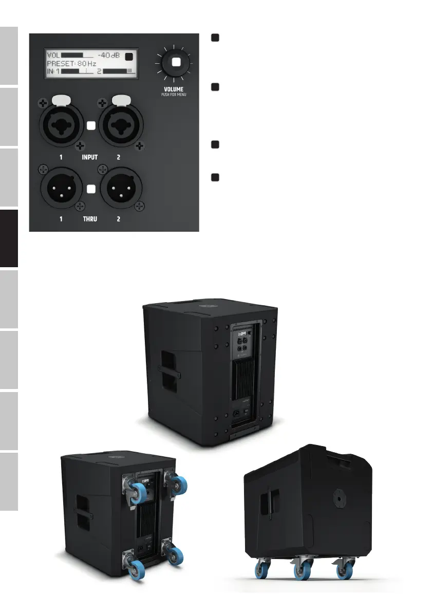 La parte trasera del subwoofer está preparada para instalar cuatro ruedas de transporte, disponibles opcionalmente, cada una de ellas embutida y