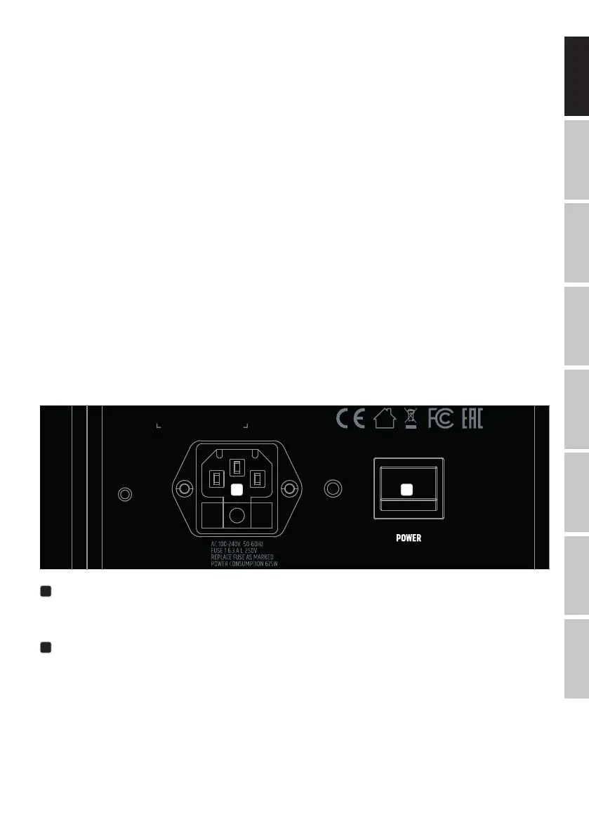 IEC power socket with integrated fuse holder. A suitable power cable is included in delivery.