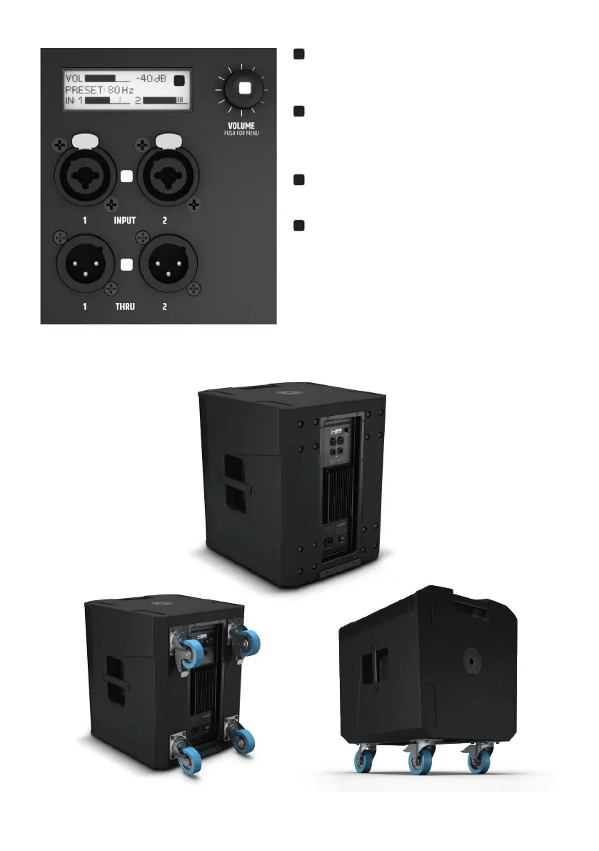 重低音喇叭的背面經過設計,可附加四個選擇性搬運腳輪,每個腳輪配備四個工廠出貨的固定螺絲,並可嵌入。孔距已標