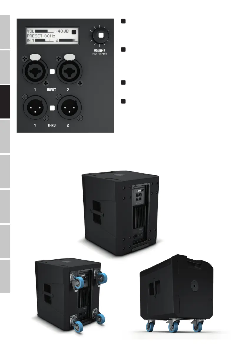 L‘arrière du caisson de basses est configuré pour fixer quatre roulettes de transport disponibles en option, chacune équipée de quatre vis de