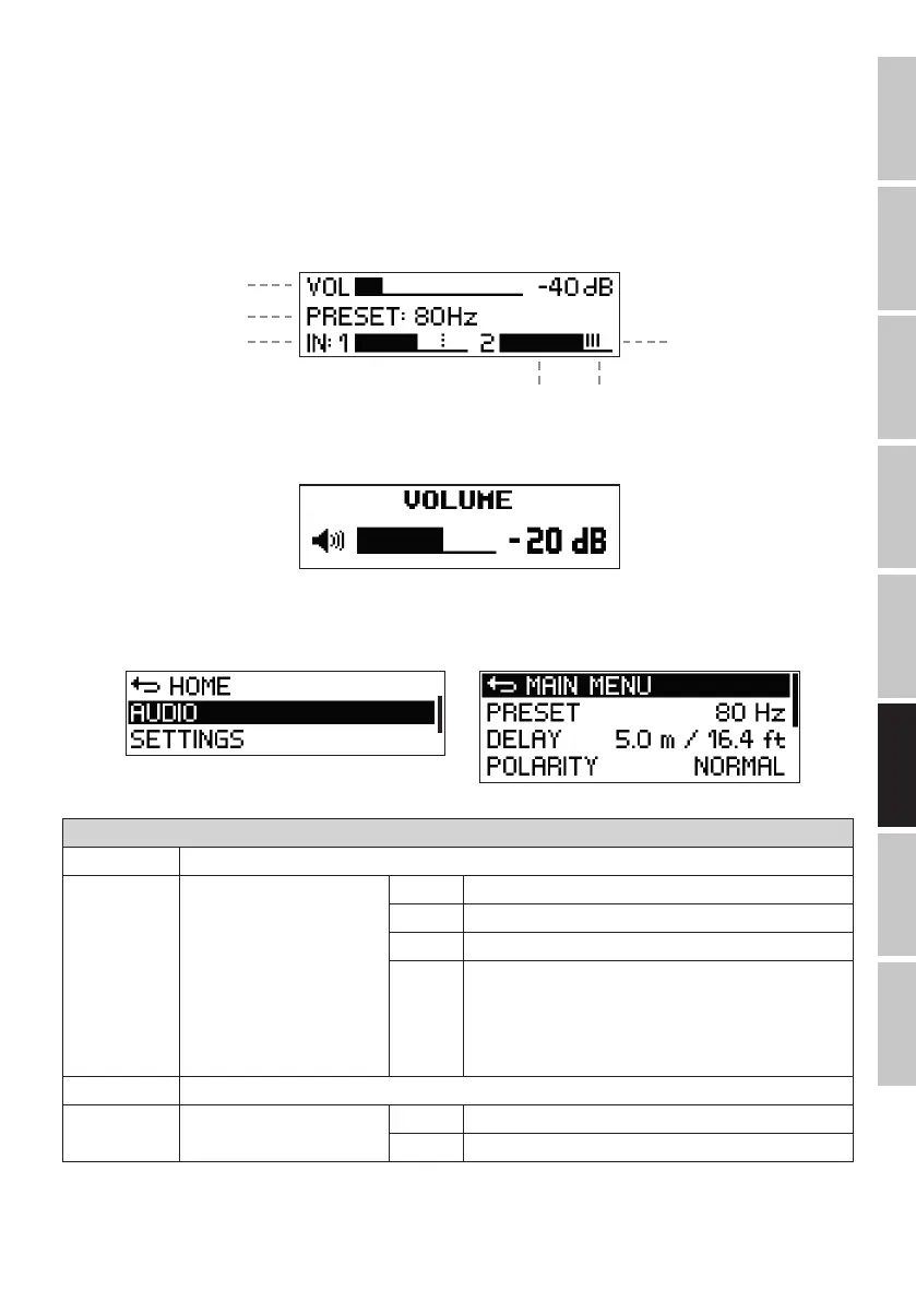 DELAY Ritardo del segnale audio per incrementi di 0,32 ft no a 32 ft (0 ft = OFF, display in metri e piedi)