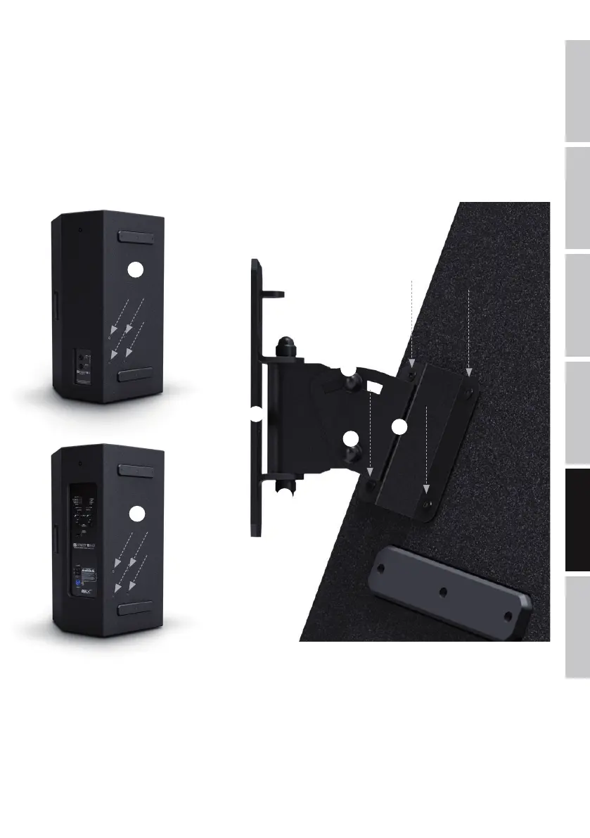 4. Teraz umieść głośnik z zamontowanym wspornikiem U i płytą montażową B na uchwycie na ścianie, ponownie włóż śrubę D w wyznaczonej