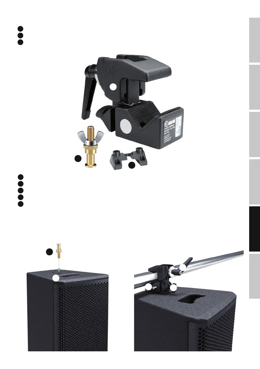Zdejmij nakrętkę motylkową M10 ze śrub mocujących (nr 2) i wkręć ją w gwint M10 u góry głośnika.
