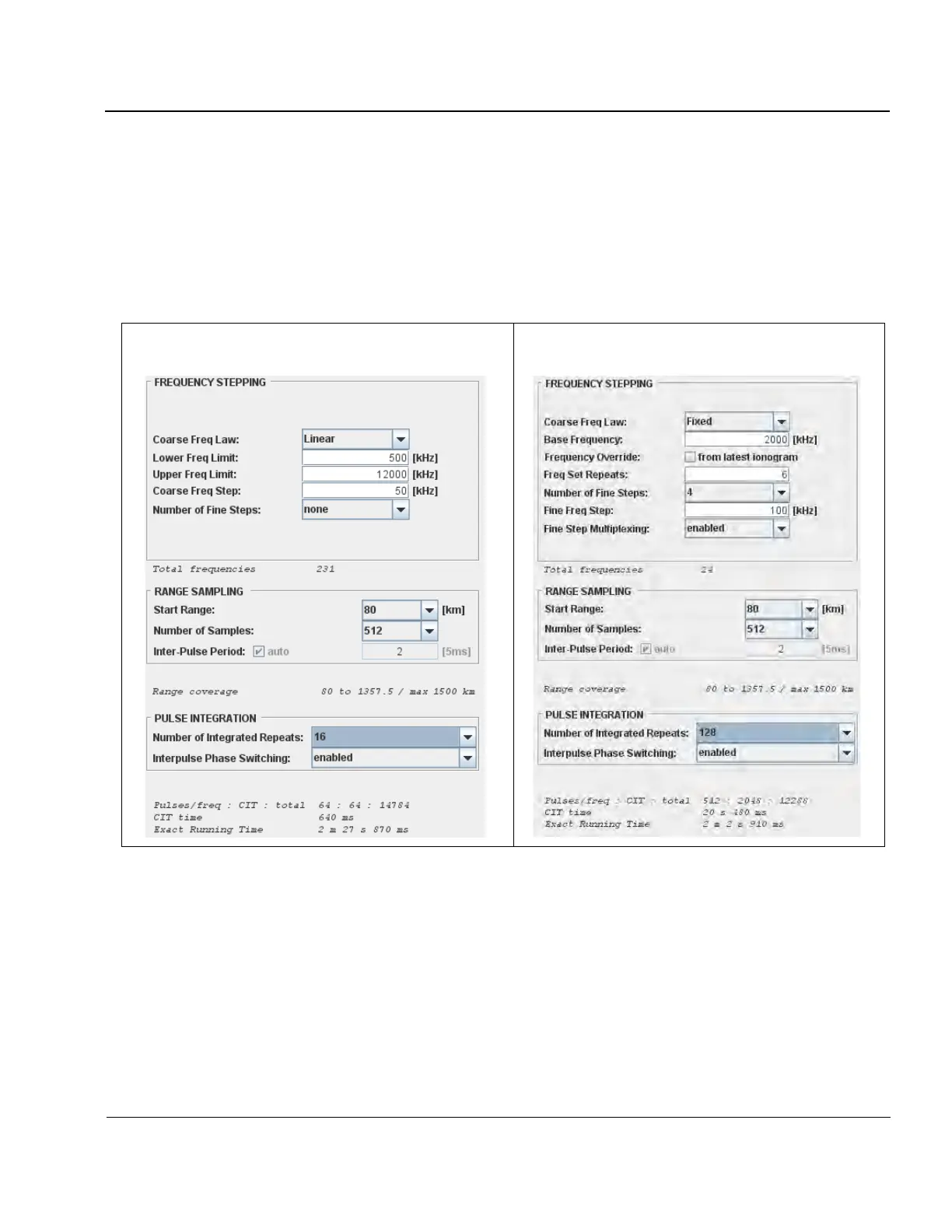 pulses are transmitted on each frequency, totaling 64 x 231 = 14784 pulses needed to complete the ionogram