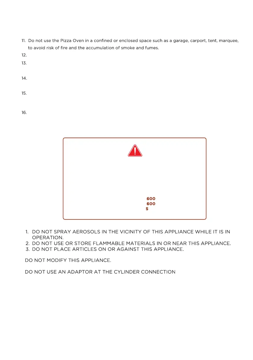 Do not obstruct the flow of ventilation air around the Pizza Oven housing. This Pizza Oven is not