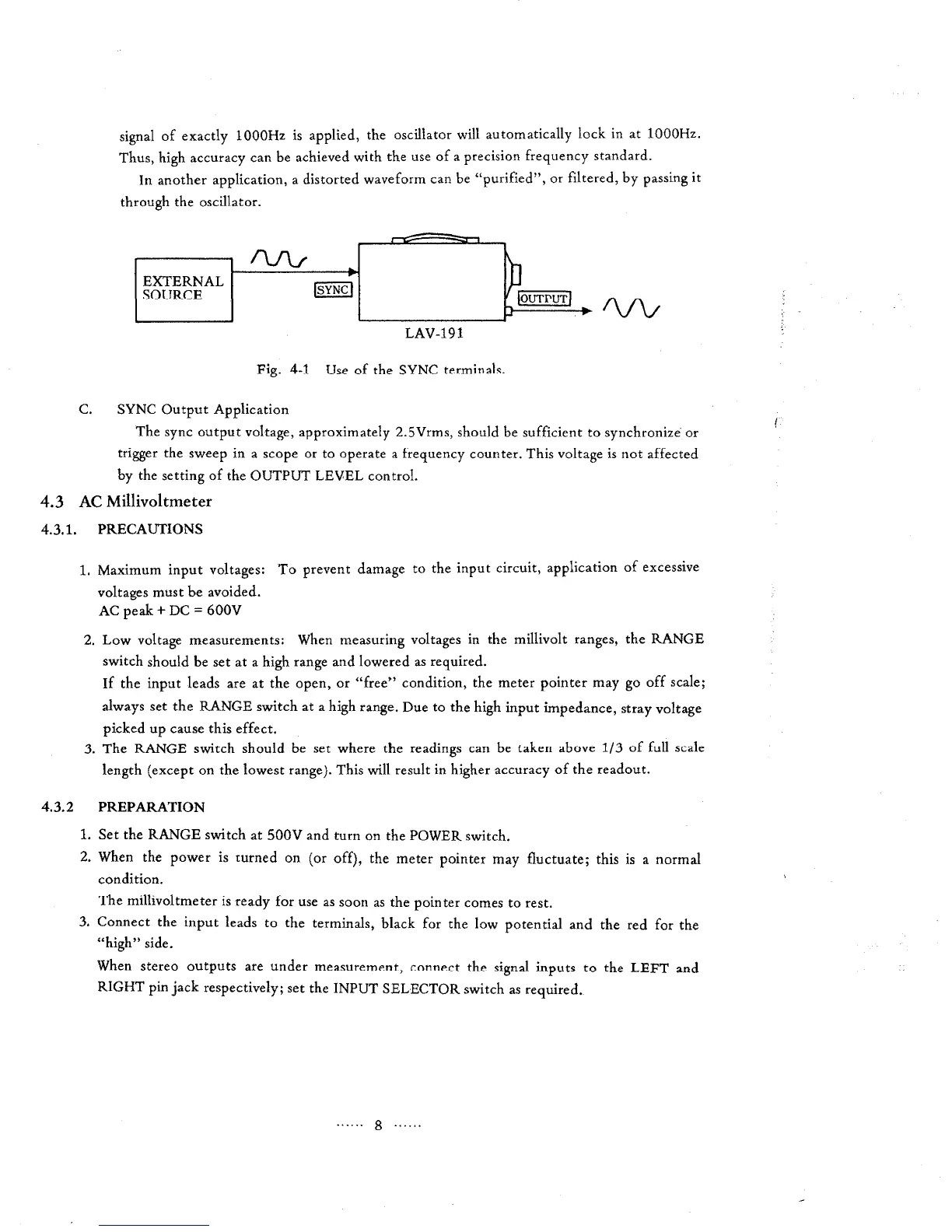 Leader Electronics Corp. LAV-191 - AC Millivoltmeter Precautions; AC Millivoltmeter Preparation