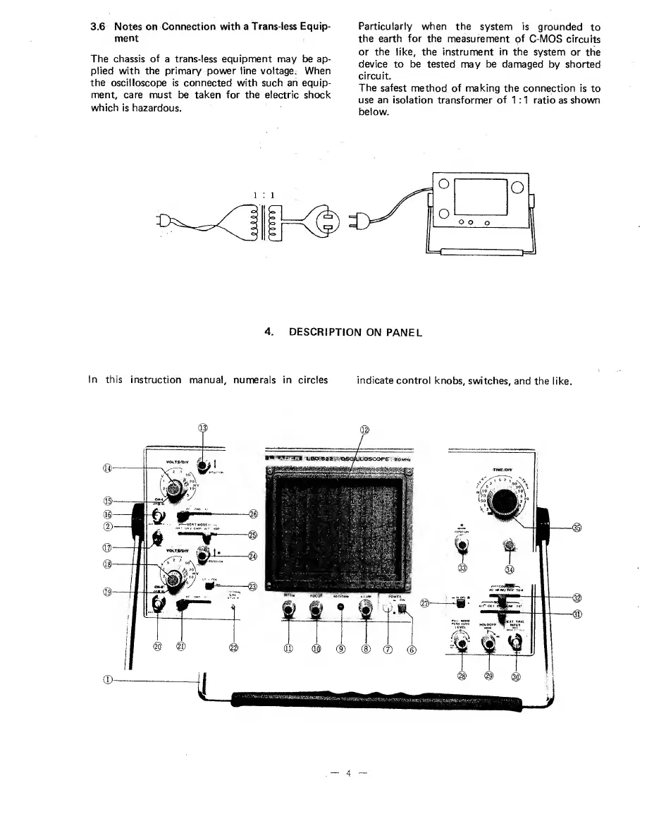 Leader Electronics Corp. LBO-522 - Notes on Connection with a Trans-Less Equipment; Description on Panel