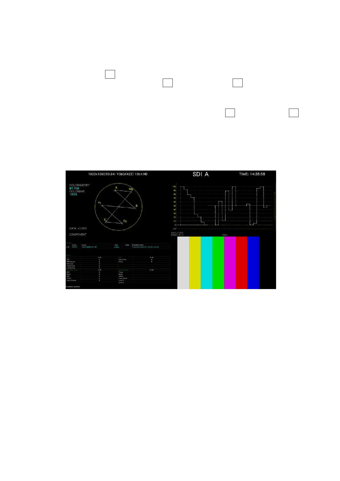 The vector, video signal waveform, status, and picture are displayed in four divided