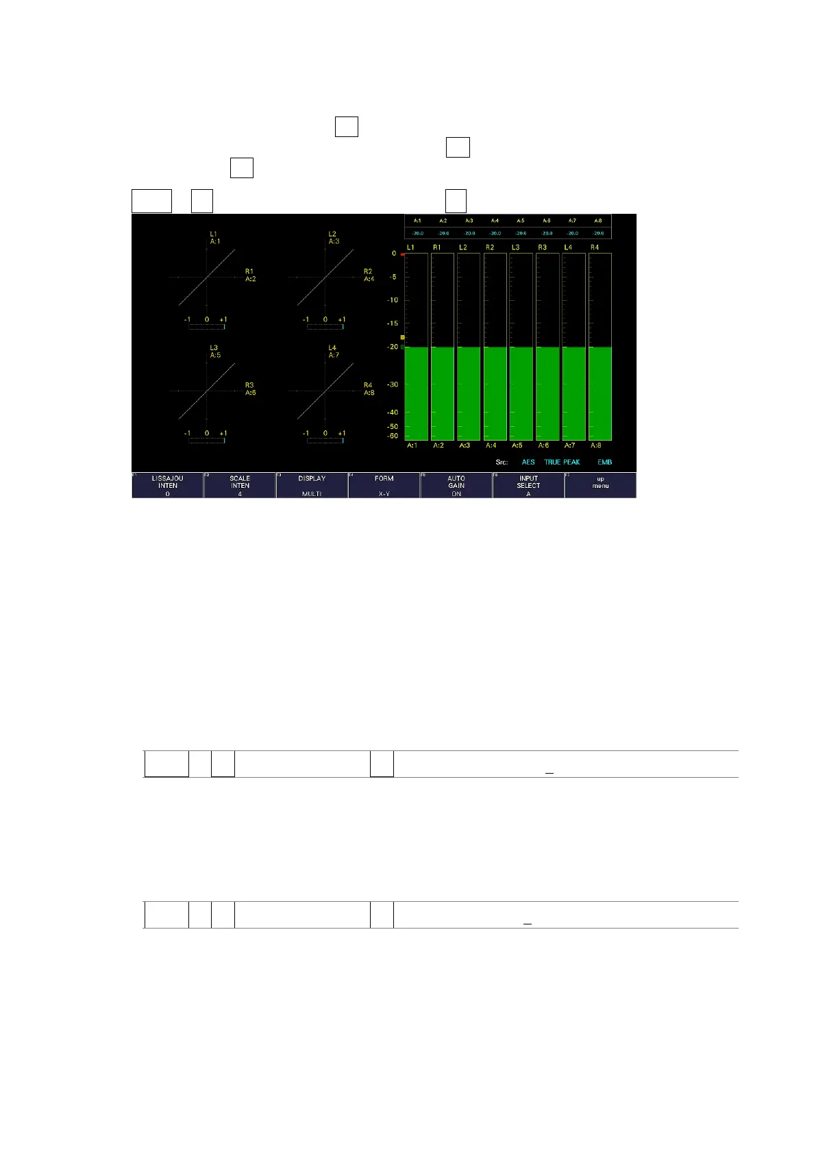 AUDIO → F•3 LISSAJOU SETUP → F•2 SCALE INTEN: -8 - 4 - 7