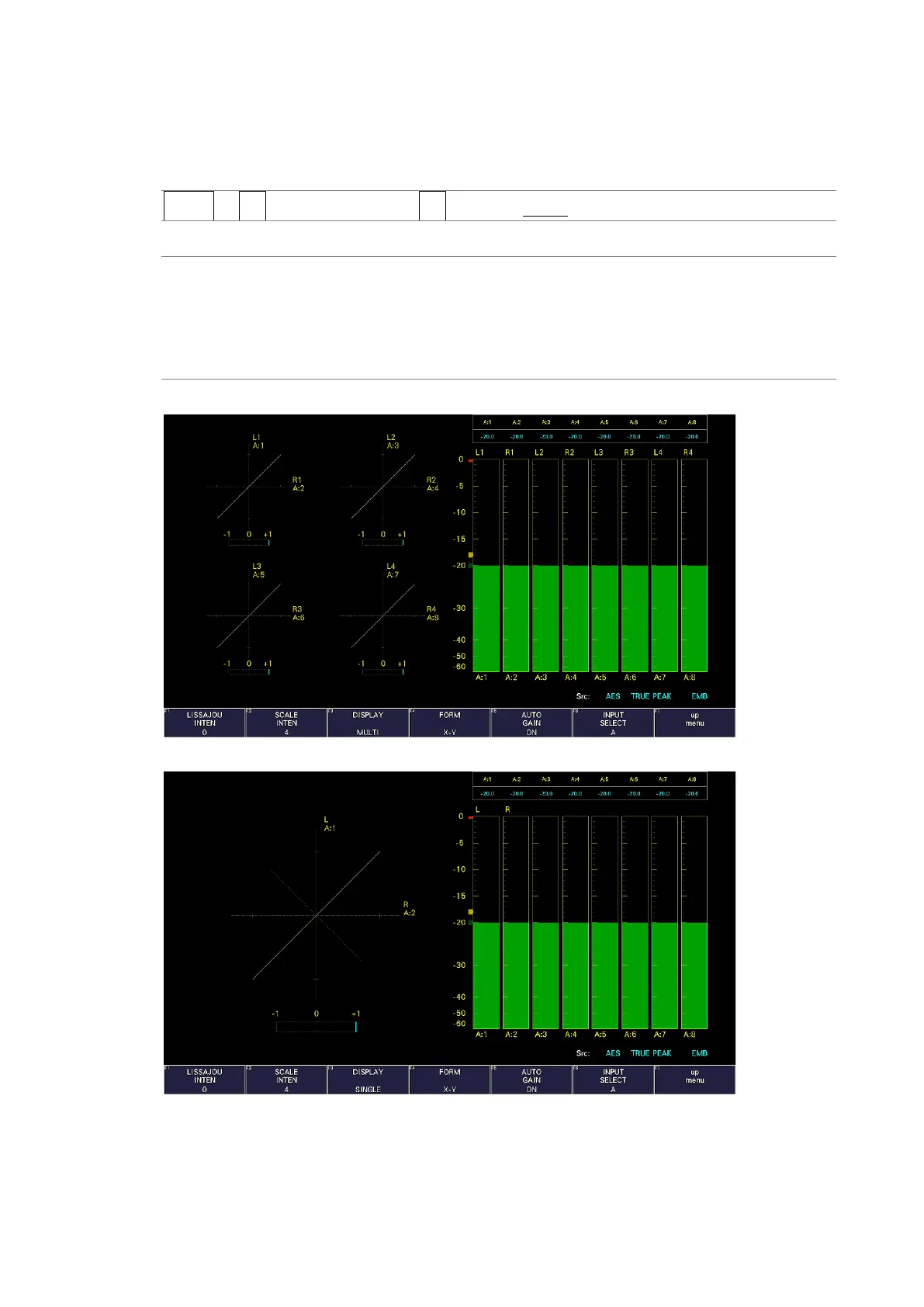 AUDIO → F•3 LISSAJOU SETUP → F•3 DISPLAY: MULTI / SINGLE