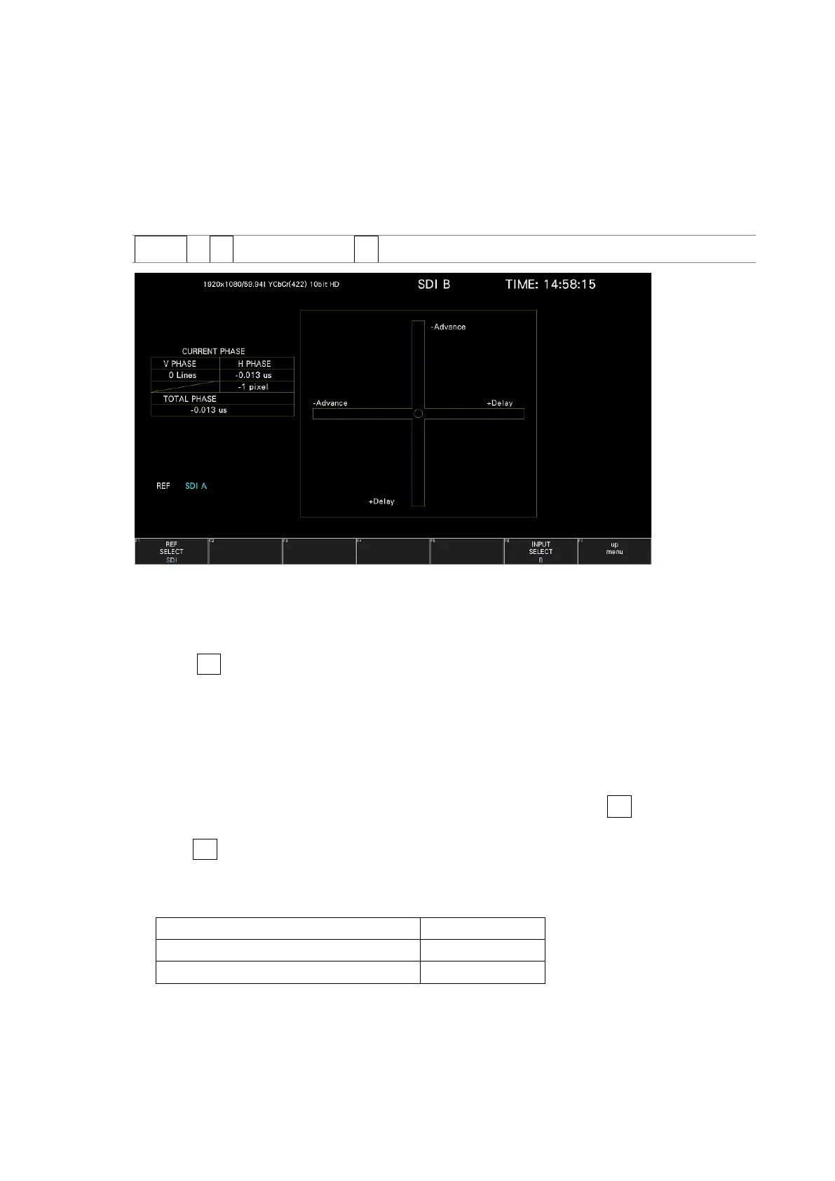 You can measure the phase difference between SDI signals by setting F•1 REF SELECT to