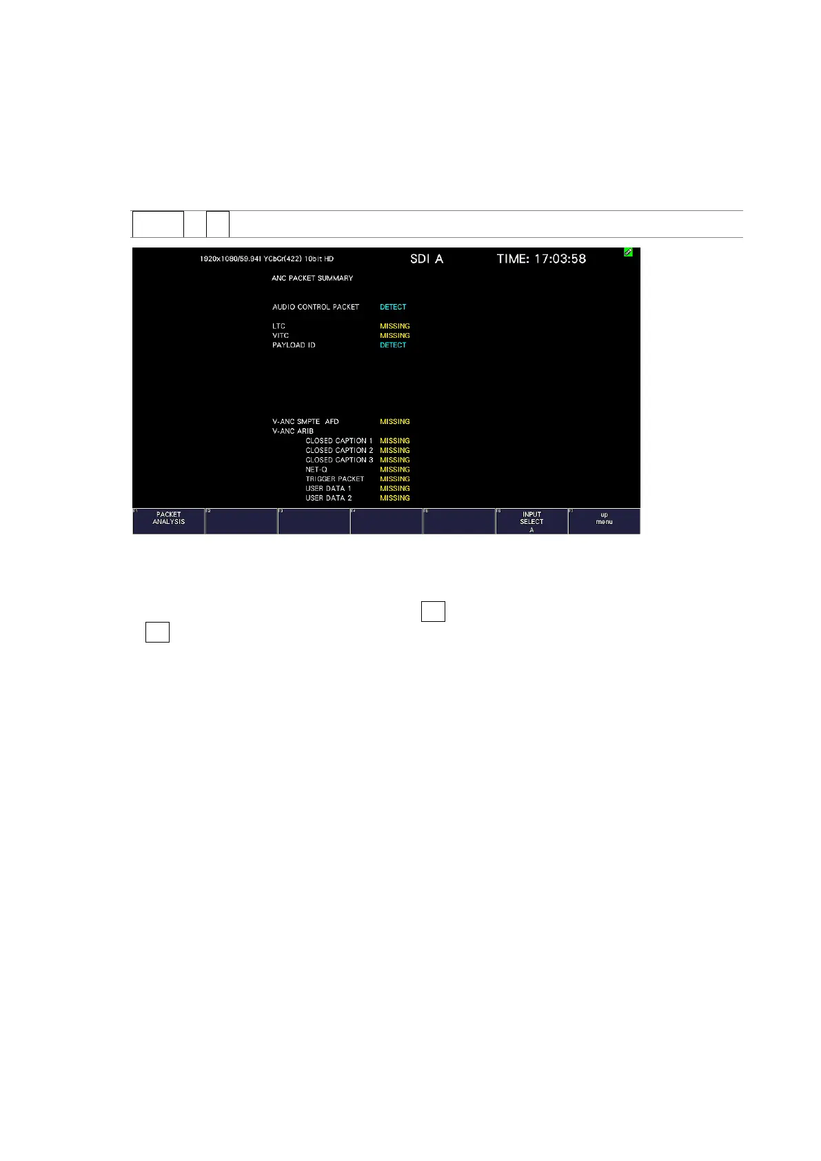 If an ancillary packet is detected, “DETECT” appears. If not, “MISSING” appears. If a dummy