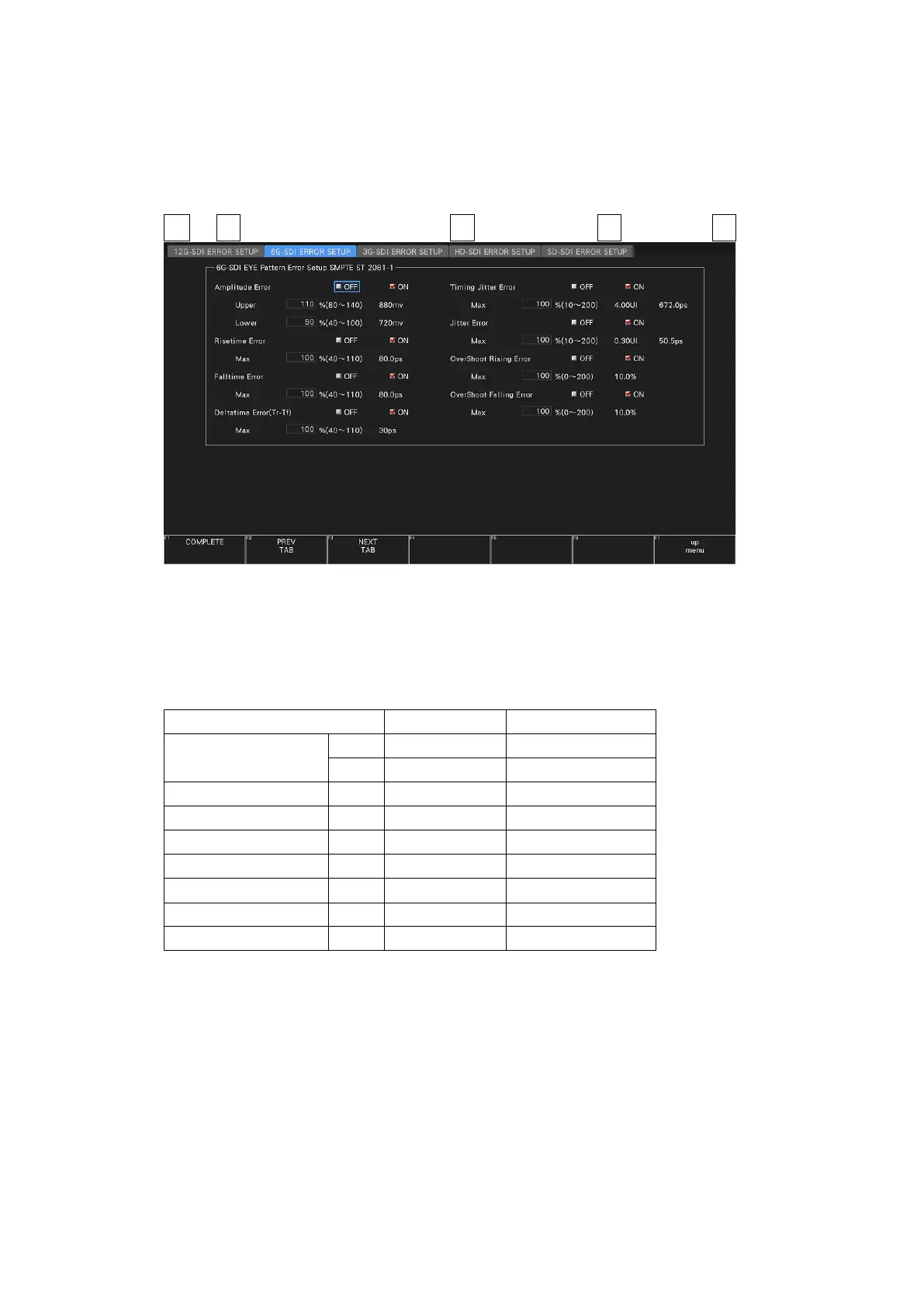 EYE → F•1 EYE/JITTER INTEN/CONFIG → F•5 ERROR SETUP → F•2 PREV TAB or F•3 NEXT TAB →