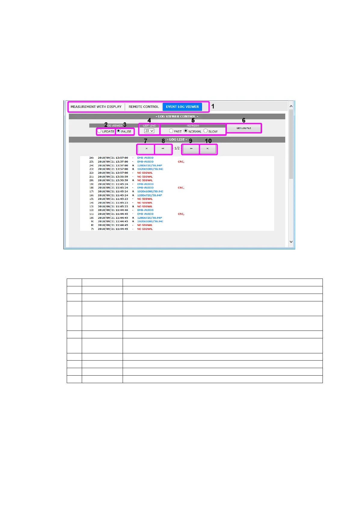 The next newer log page appears when LOG VIEWER is set to PAUSE.