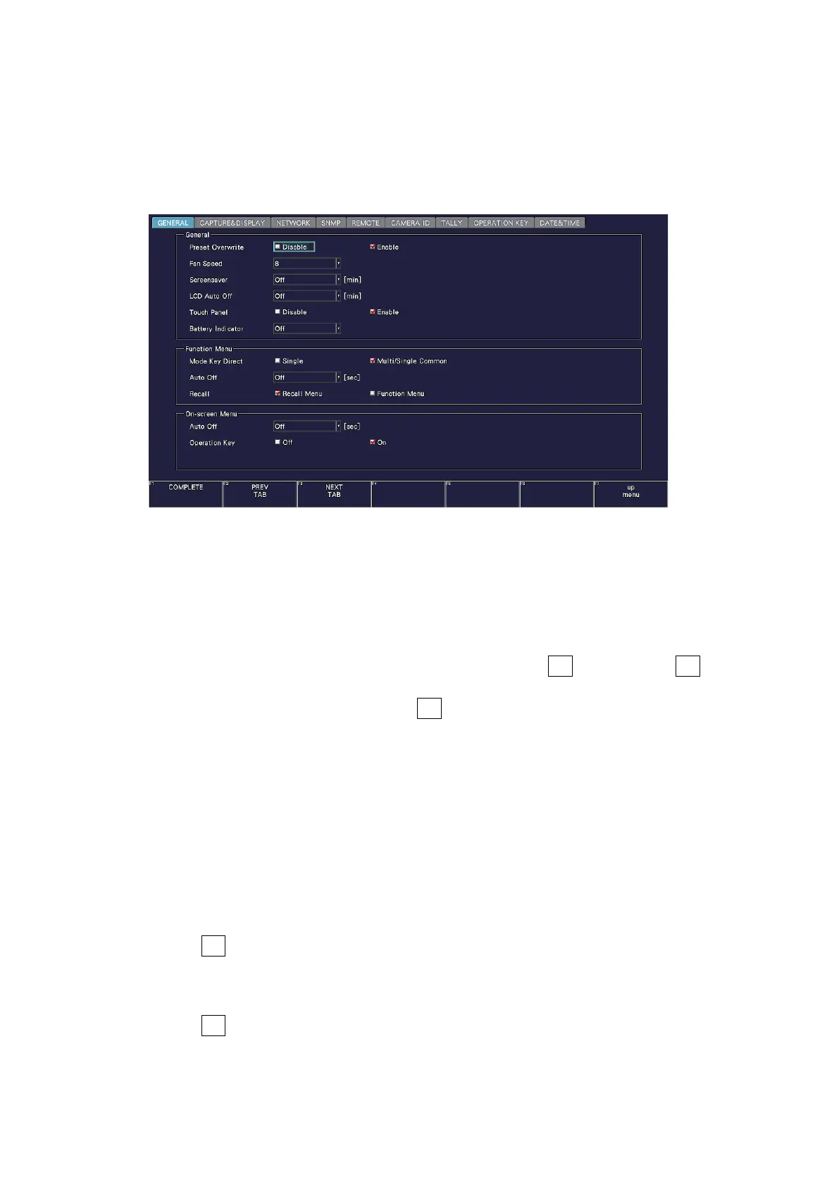 This section explains how to operate the tab menu, using the GENERAL tab menu as an