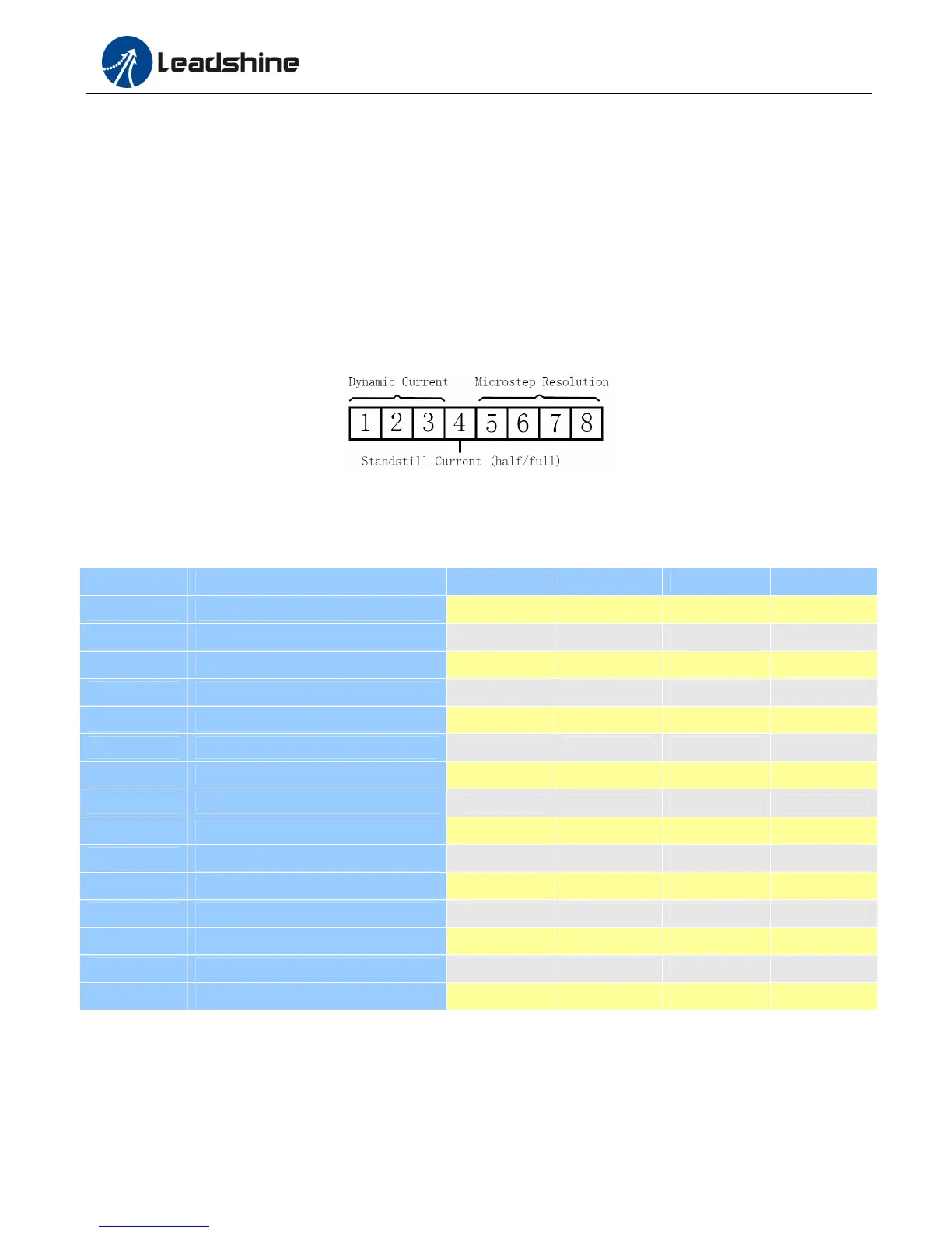 This driver uses an 8-bit DIP switch to set microstep resolution, and motor operating current, as shown below: