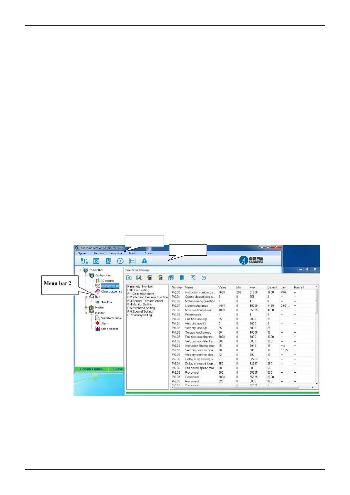 There are two menu bars, menu bar 1 is used to set up the Leadshine Studio software, menu bar 2