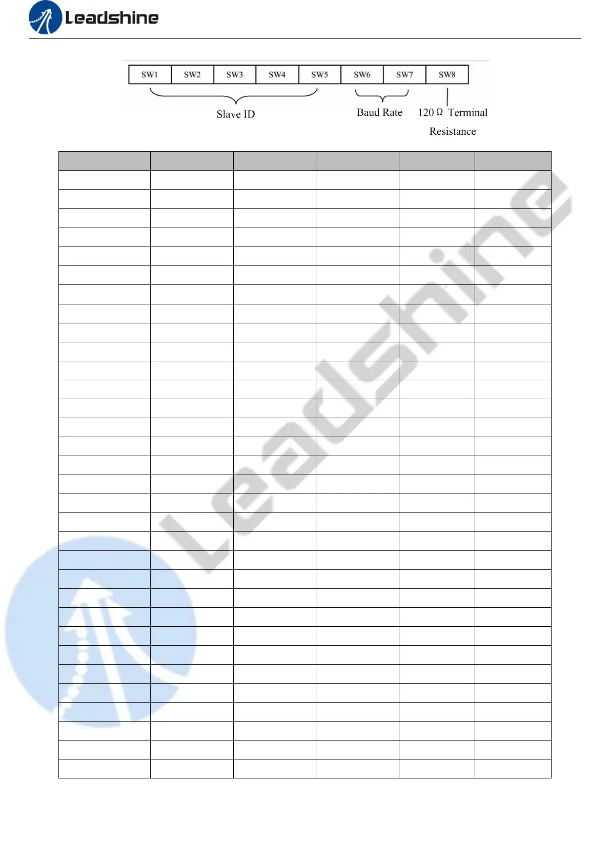 Note: (1) When the SW1-SW5 is default (all are on), the Slave ID can be configured by the PC software