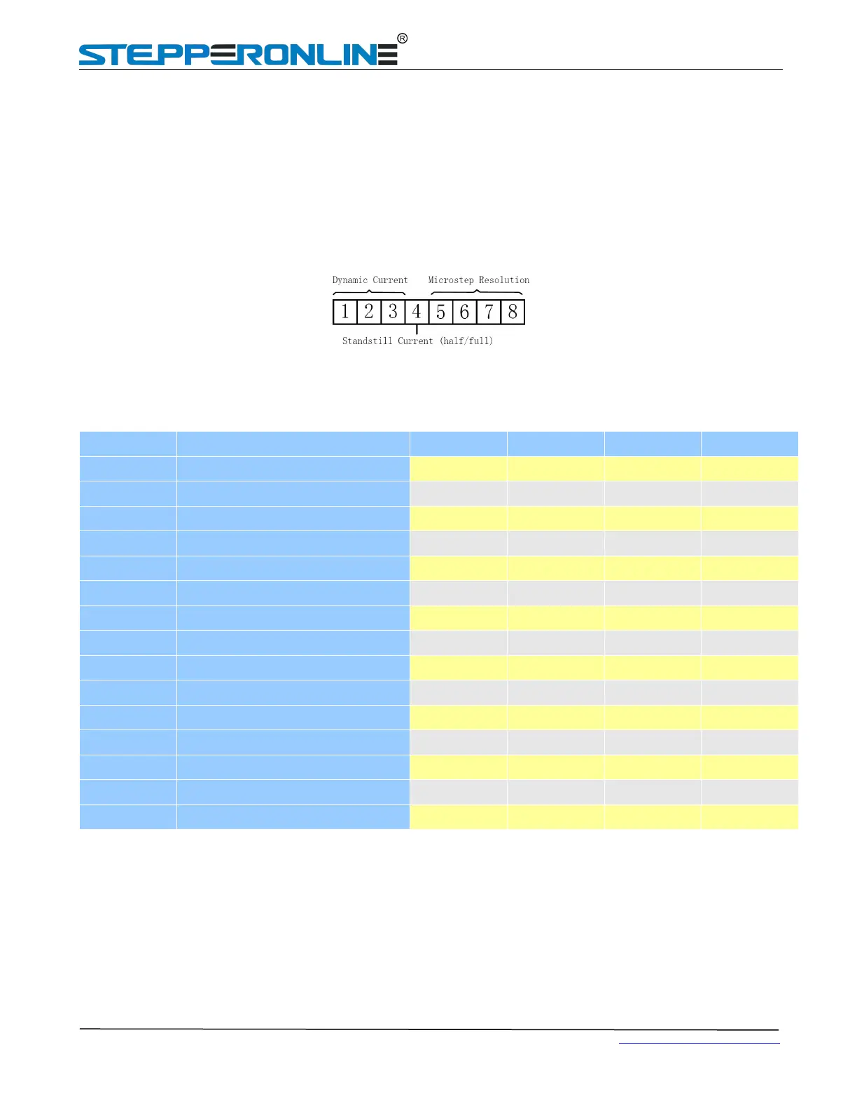 This drive uses an 8-bit DIP switch to set microstep resolution, and motor operating current, as shown below: