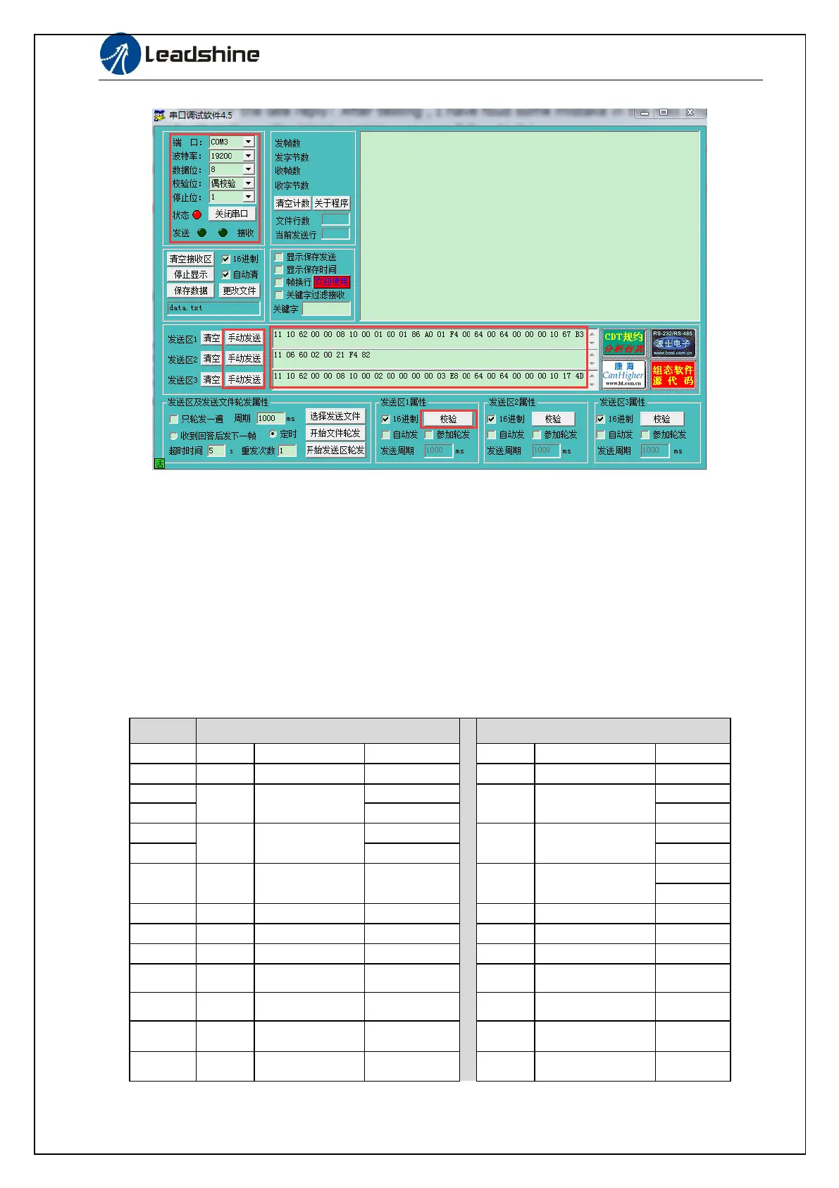 Fill in the data frame format in the sending area (according to relevant motion commands), and the last two bit
