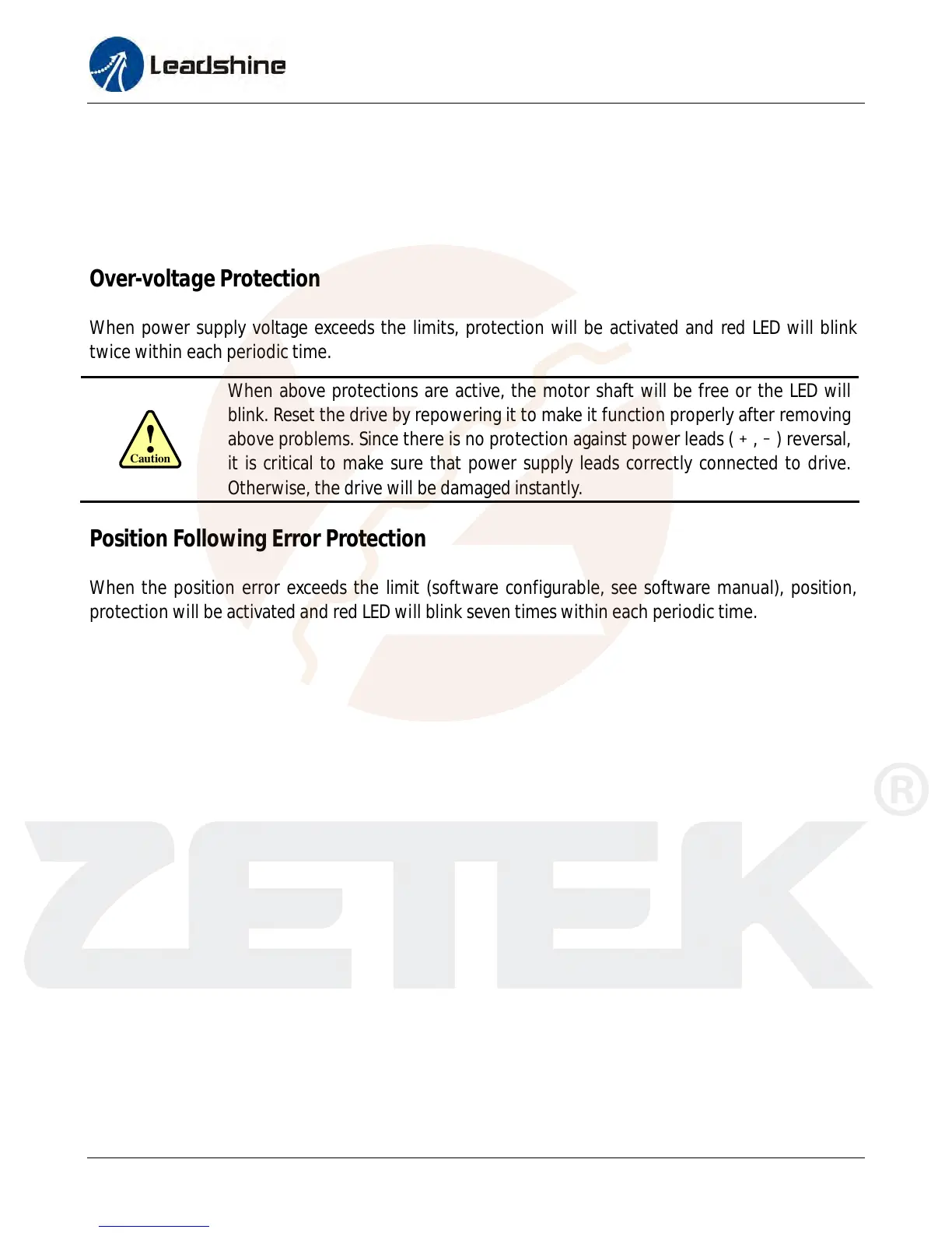 When above protections are active, the motor shaft will be free or the LED will