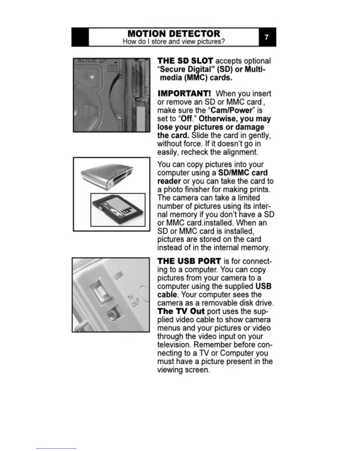 leaf river IR-5 - MOTION DETECTOR Storage and Output; SD Card Slot Usage; USB Port Connectivity; TV Out Port Function