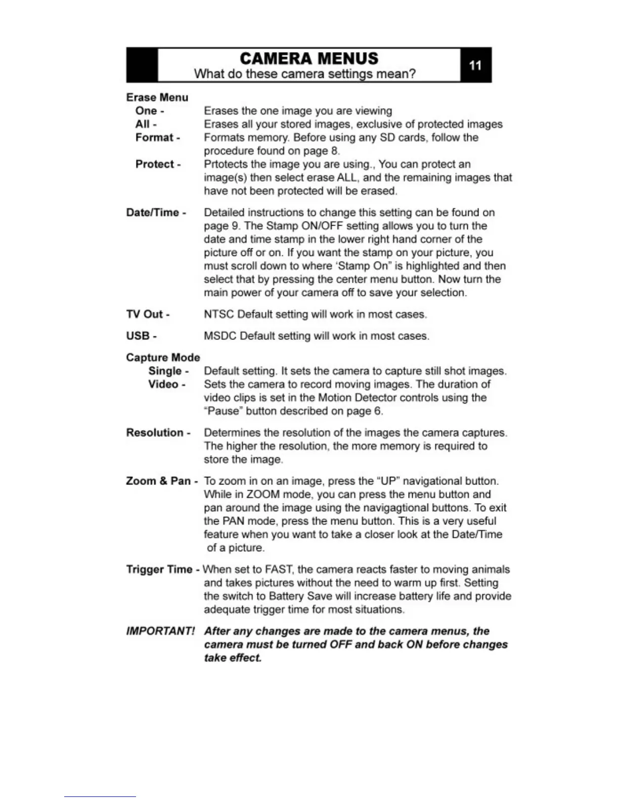 leaf river IS7SS - CAMERA MENUS; Erase, Date;Time, and Connectivity Settings; Capture, Resolution, and Trigger Settings