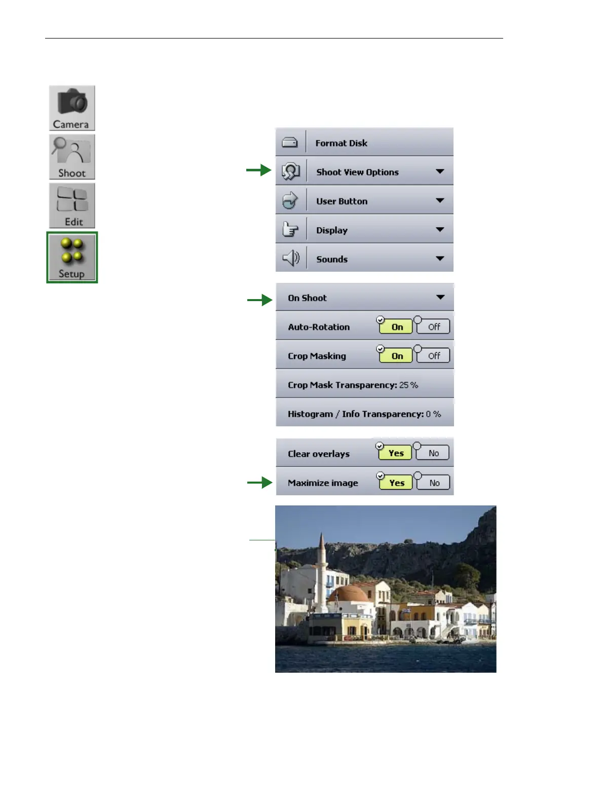 To hide the menu buttons for a full-screen view of your shots: