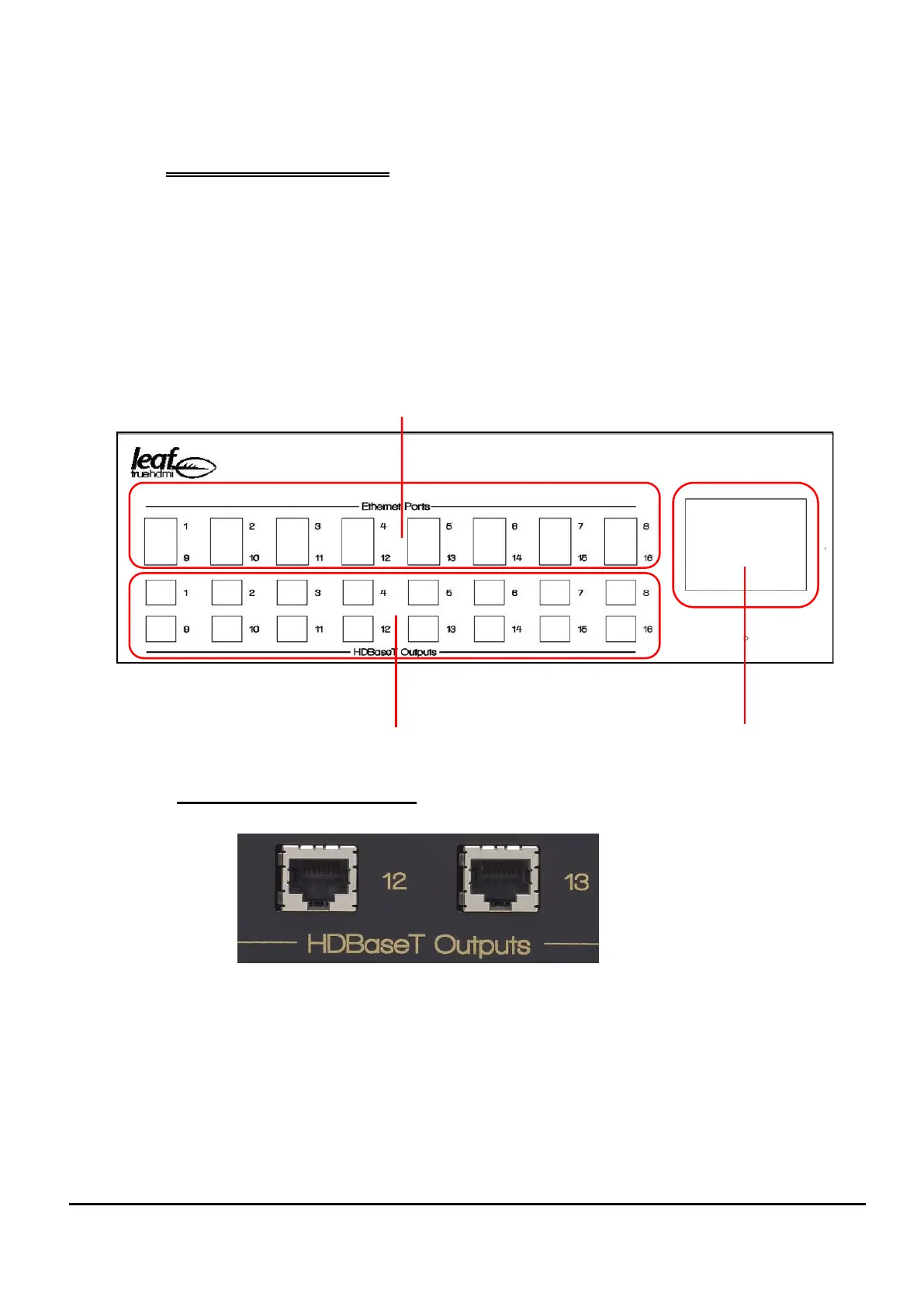 1. 16 x HDBase T RJ45 type ports labelled HDBaseT outputs for connection to the