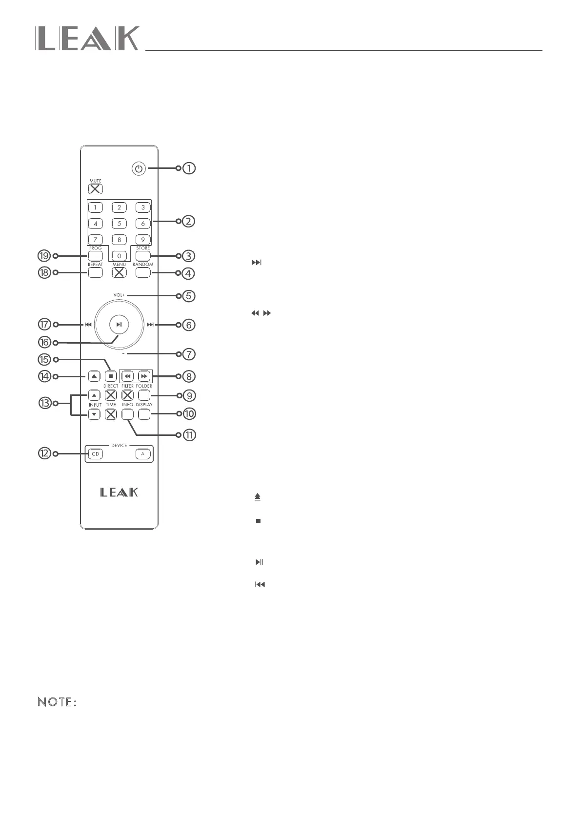 NOTE : the handset buttons shown crossed out are for use with other LEAK units such as the LEAK Stereo 130 and are therefore not functional when used with