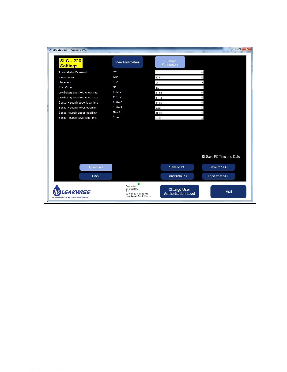 Pressing the View Parameters button returns the display to the basic SLC-220 parameters.