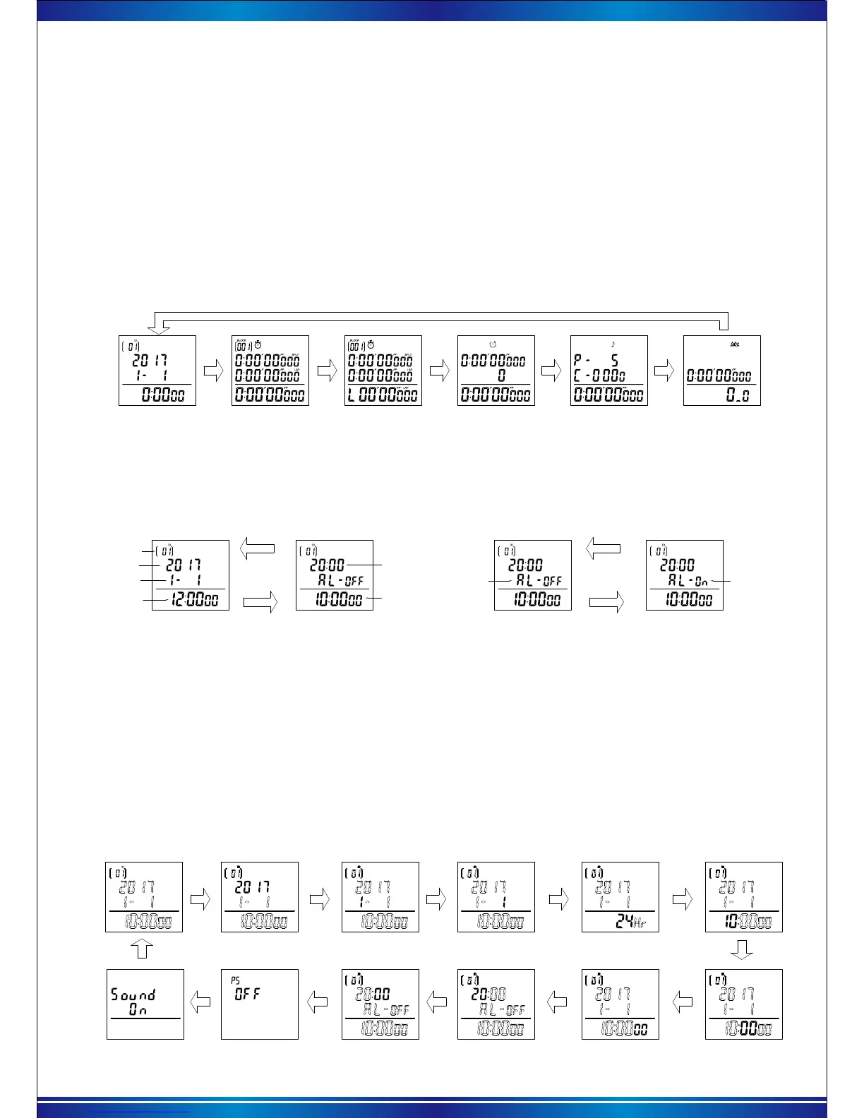 → Minute for alarm→ PS power saving mode→ Sound on/off setting. The charts are as below.
