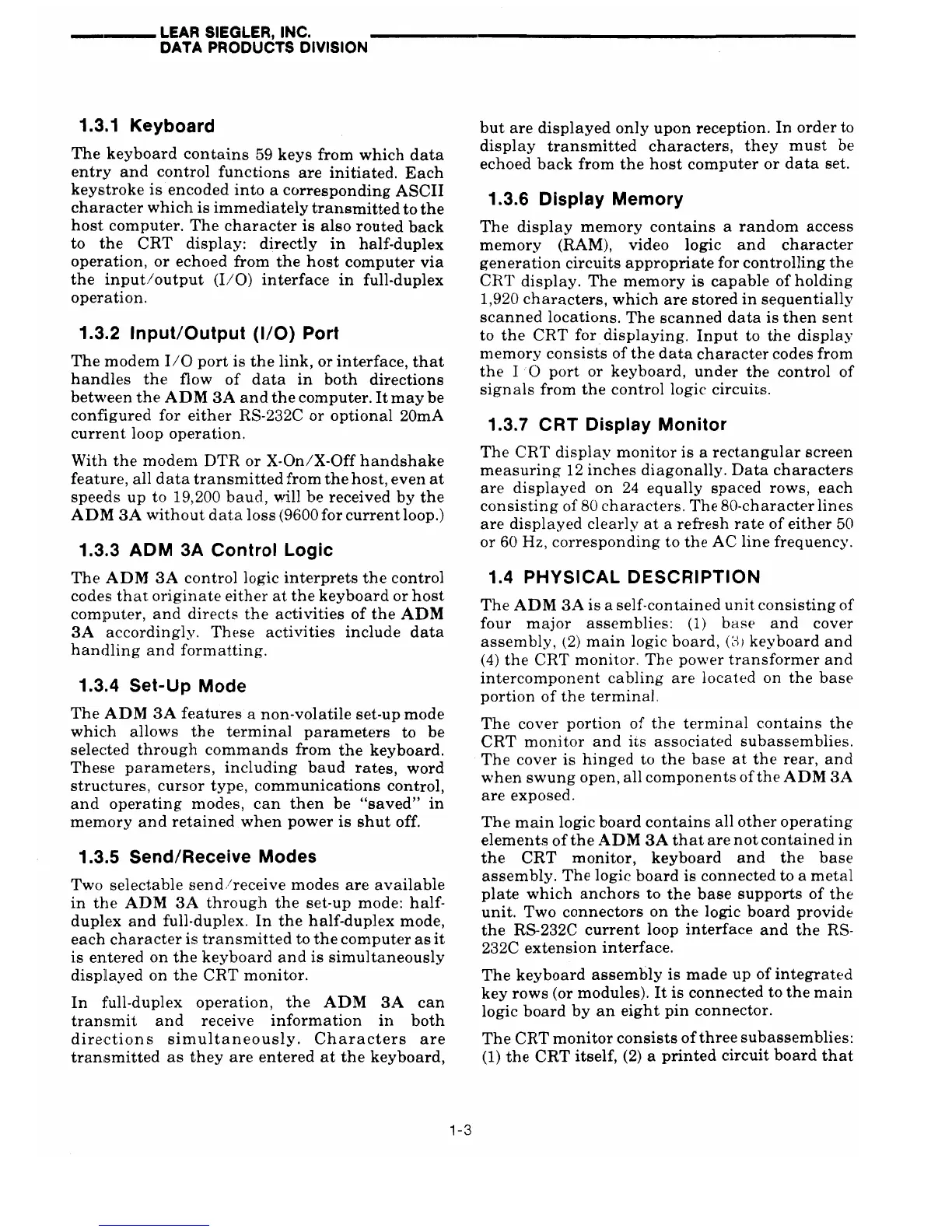 Lear Siegler ADM 3A - Input;Output (I;O) Port 1; ADM 3 A Control Logic; Set-Up Mode; Send;Receive Modes