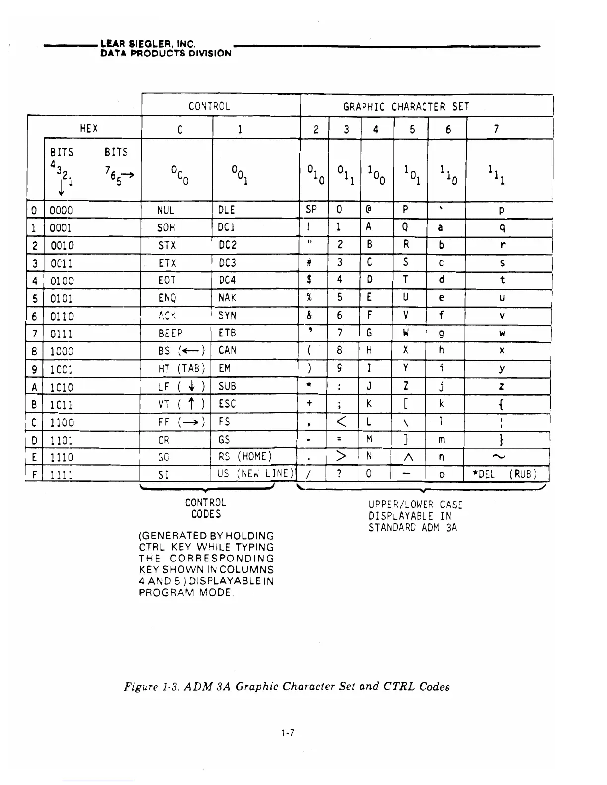 Lear Siegler ADM 3A - ADM 3 A Graphic Character Set and CTRL Codes