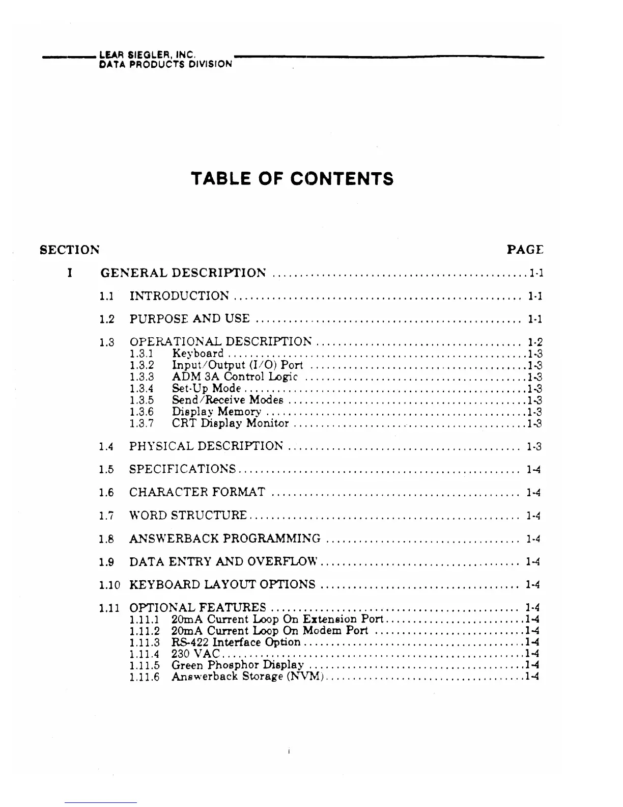 Lear Siegler ADM 3A - Table of Contents
