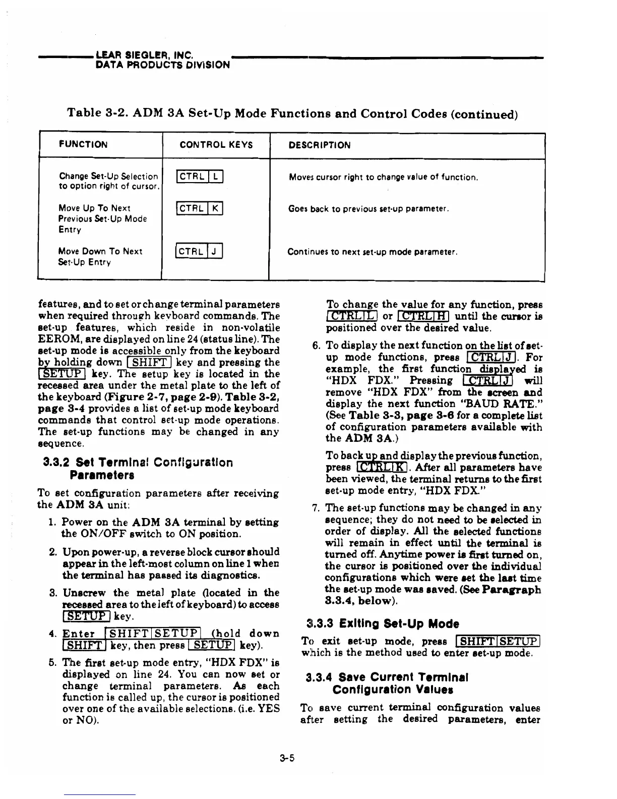 Lear Siegler ADM 3A - Set Terminal Configuration Parameters; Exiting Set-Up Mode; Save Current Terminal Configuration Values