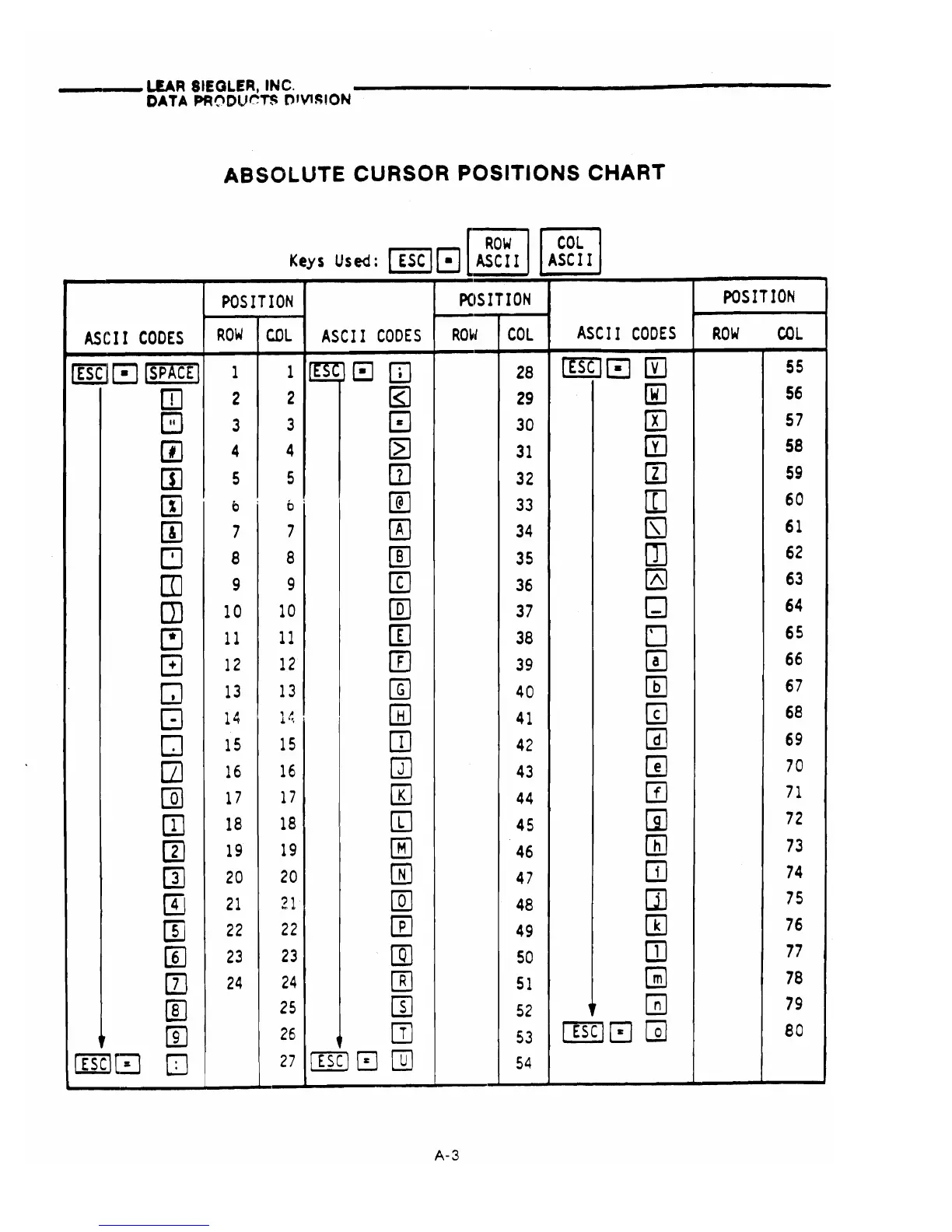 Lear Siegler ADM 3A - Absolute Cursor Positions Chart