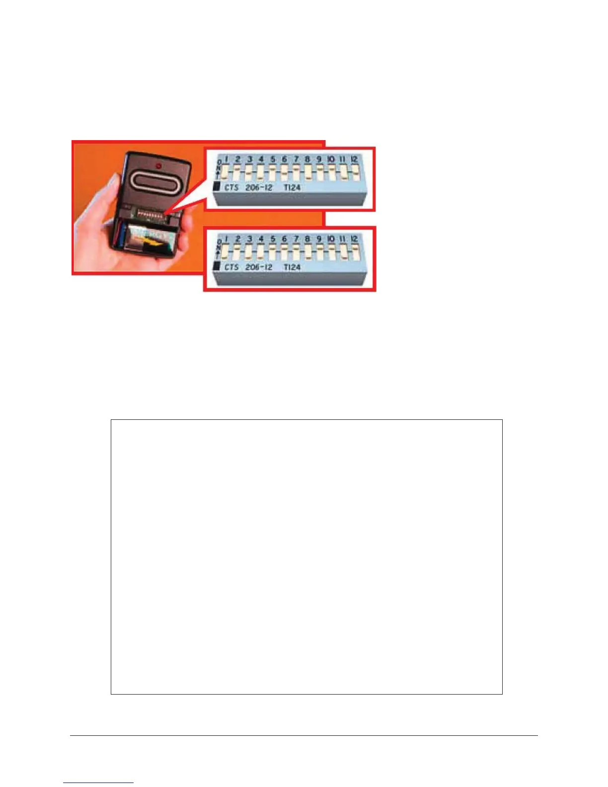 If there is a panel of (coded) DIP switches (shown below) follow the fixed code