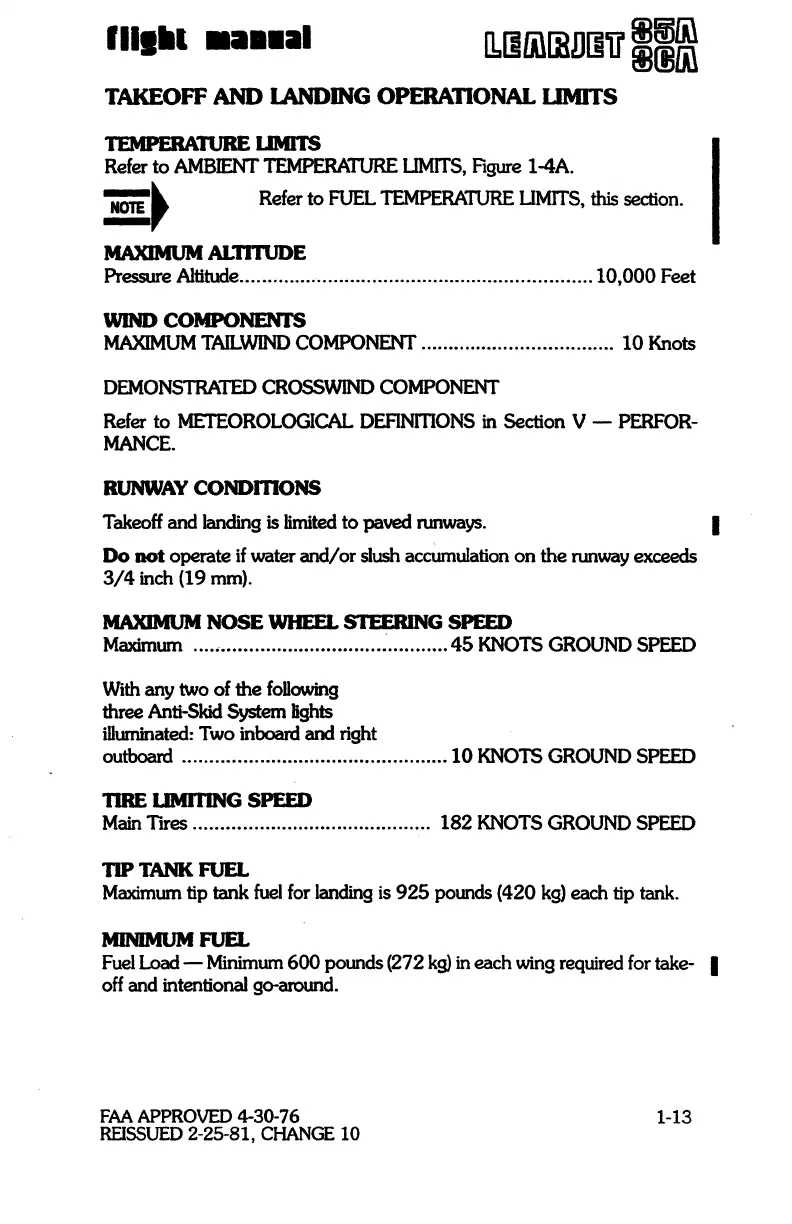 Learjet 36A - Takeoff and Landing Operational Limits; Wind Components; Maximum Nose Wheel Steering Speed; Minimum Fuel