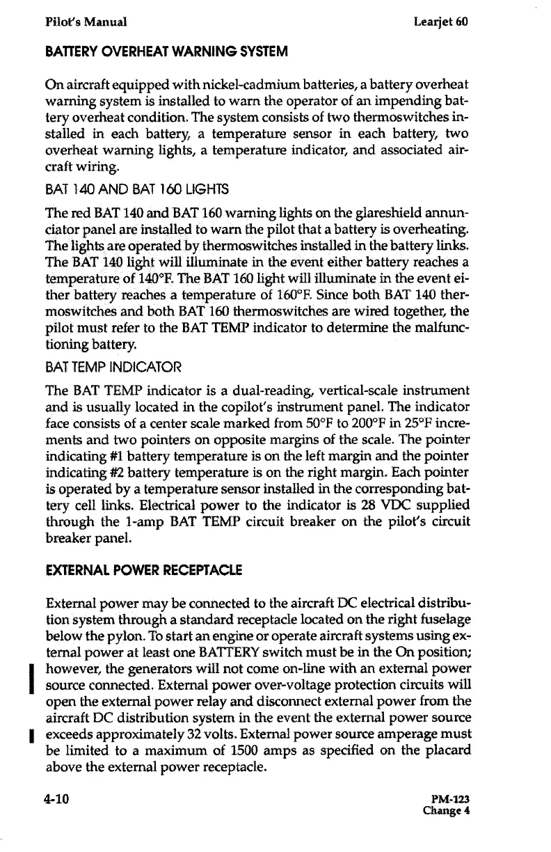 Learjet 60 - BAT 140 and BAT 160 Lights; BAT TEMP Indicator; Battery Overheat Warning System; External Power Receptacle