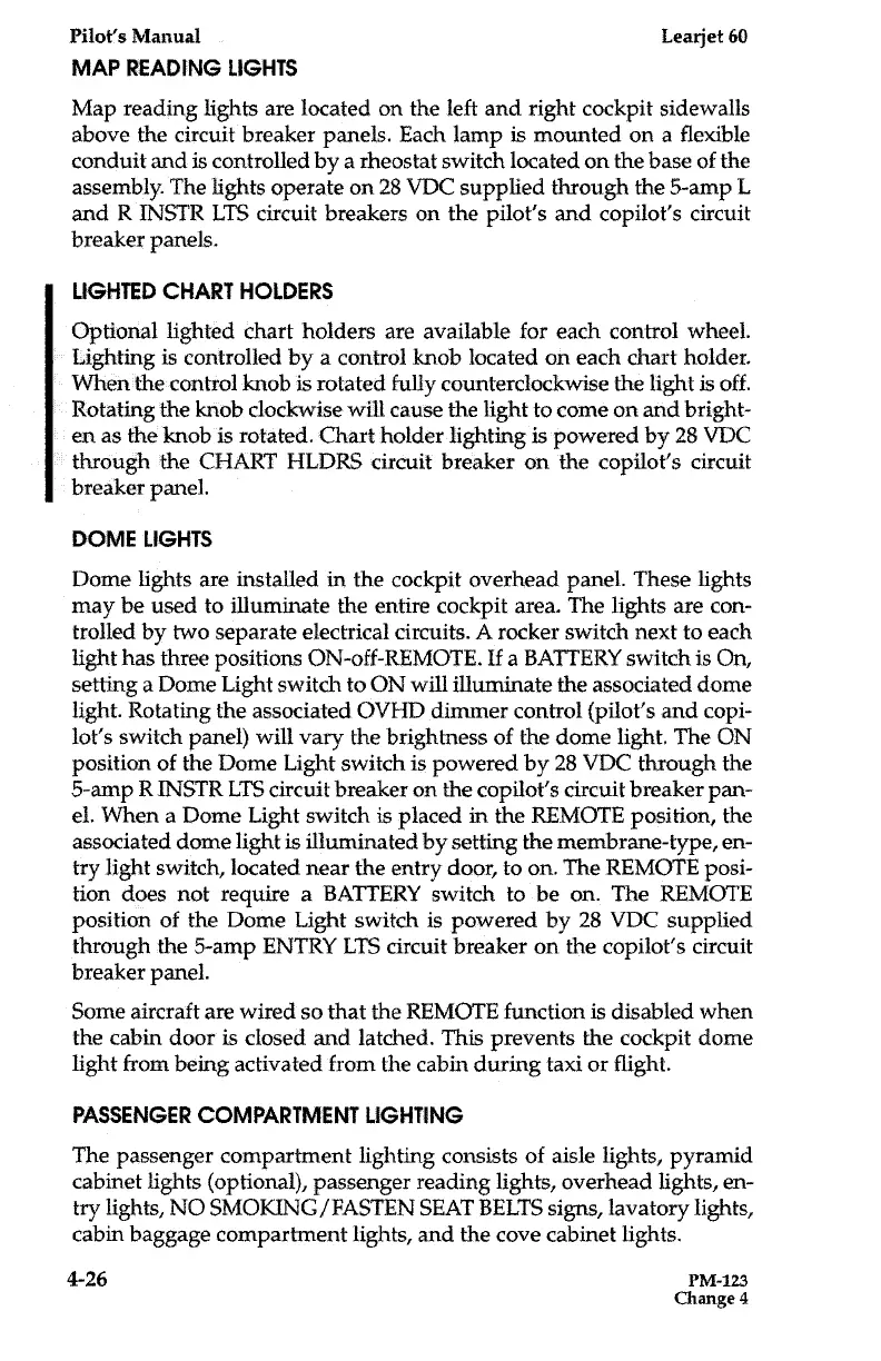 Learjet 60 - Dome Lights; Lighted Chart Holders; Map Reading Lights; Passenger Compartment Lighting