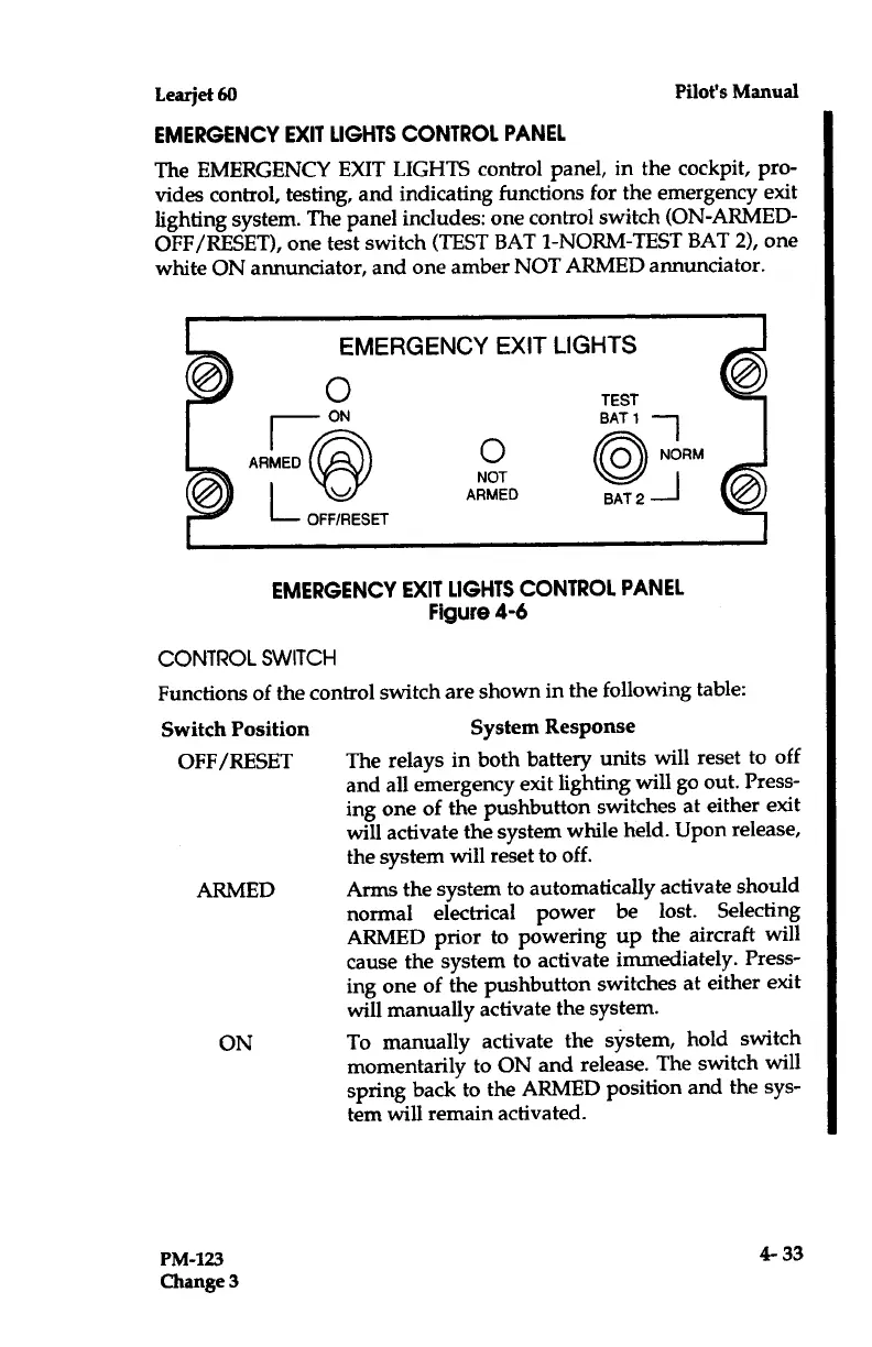 Learjet 60 - Control Switch; EMERGENCY EXIT LIGHTS Control Panel; EMERGENCY EXIT LIGHTS Control Panel (Figure 4-6)