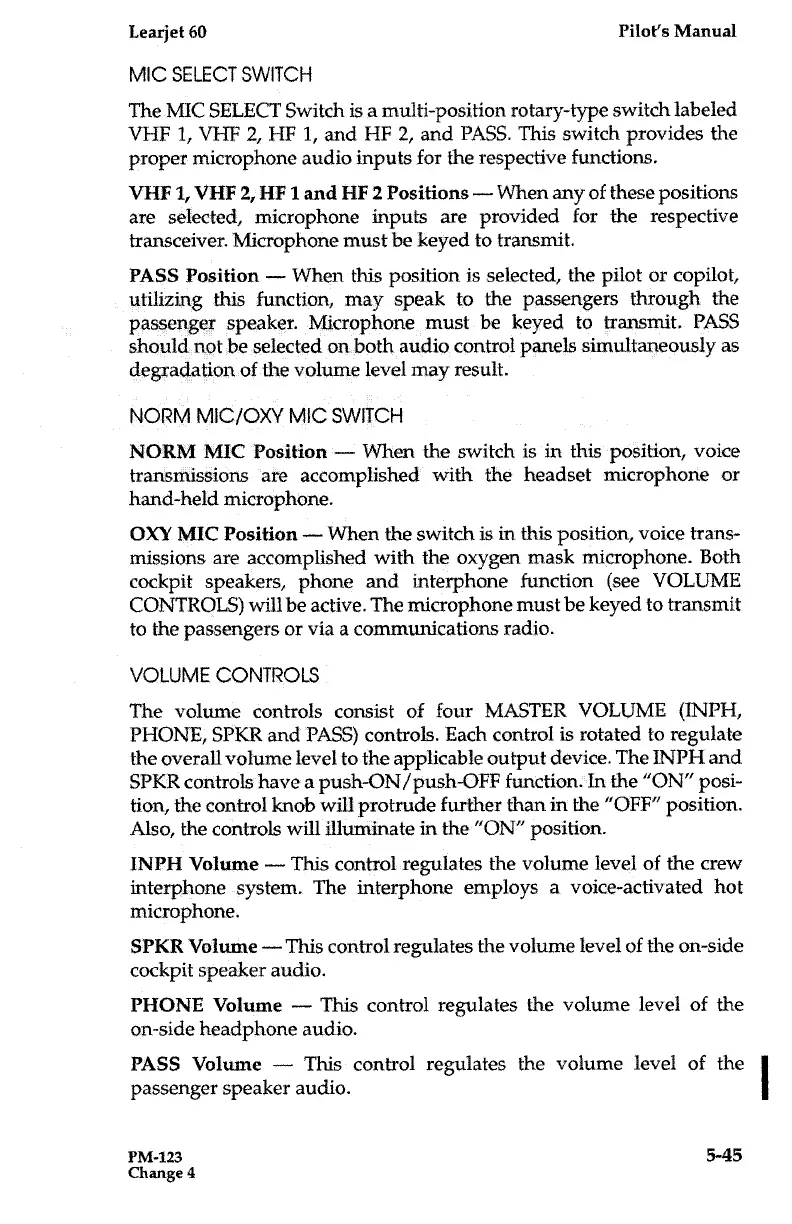 Learjet 60 - MIC SELECT Switch; NORM MIC;OXY MIC Switch; Volume Controls