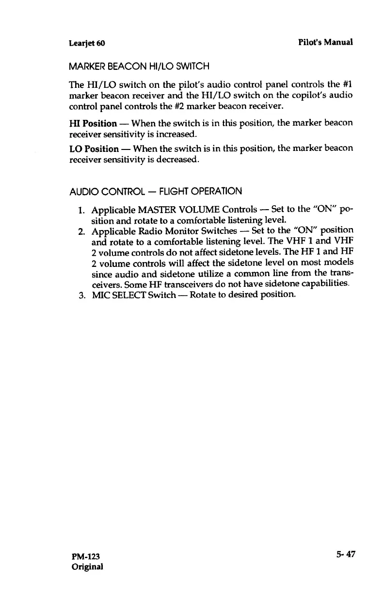 Learjet 60 - Audio Control -Flight Operation; Marker Beacon HI;LO Switch