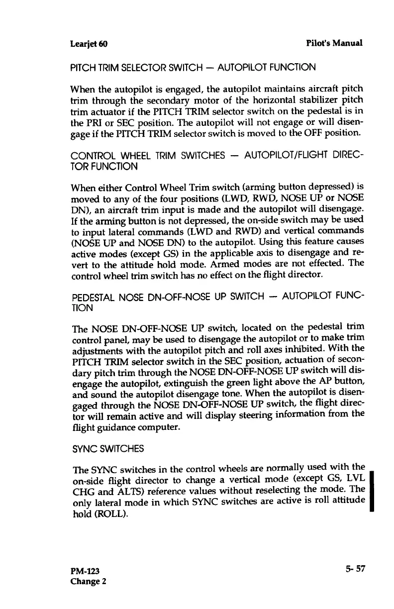 Learjet 60 - Director Function; Pedestal NOSE DN-OFF-NOSE up Switch - Autopilot; Pitch Trim Selector Switch - Autopilot Function; SYNC Switches