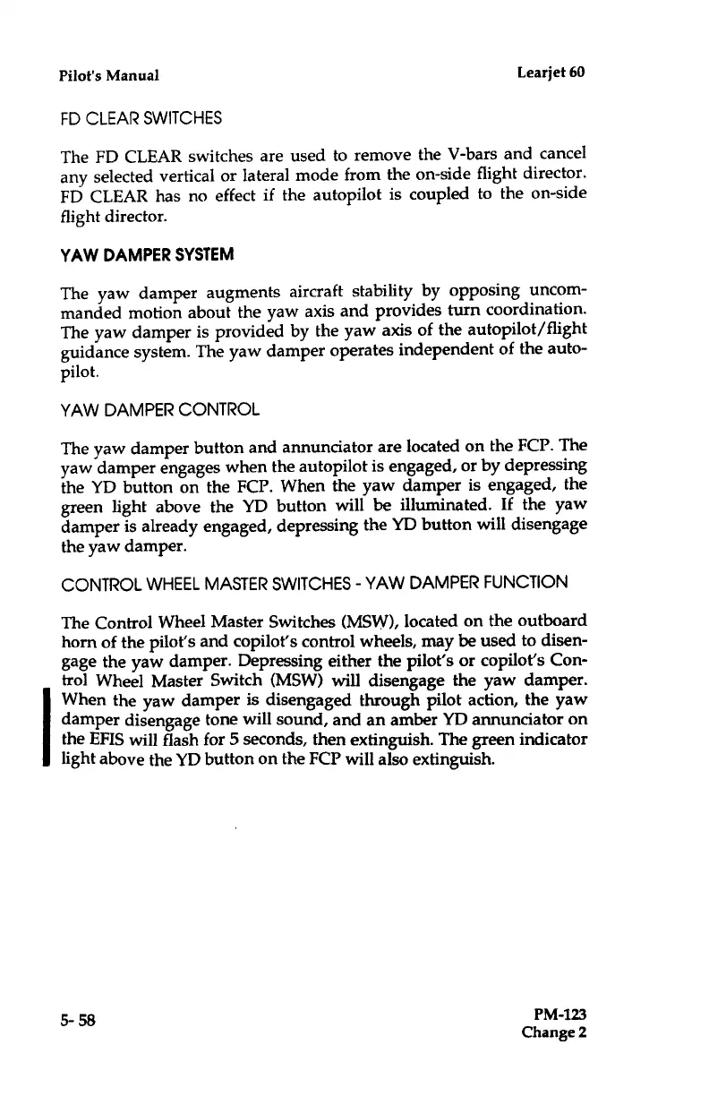 Learjet 60 - Damper Function; FD CLEAR Switches; Yaw Damper Control; Yaw Damper System