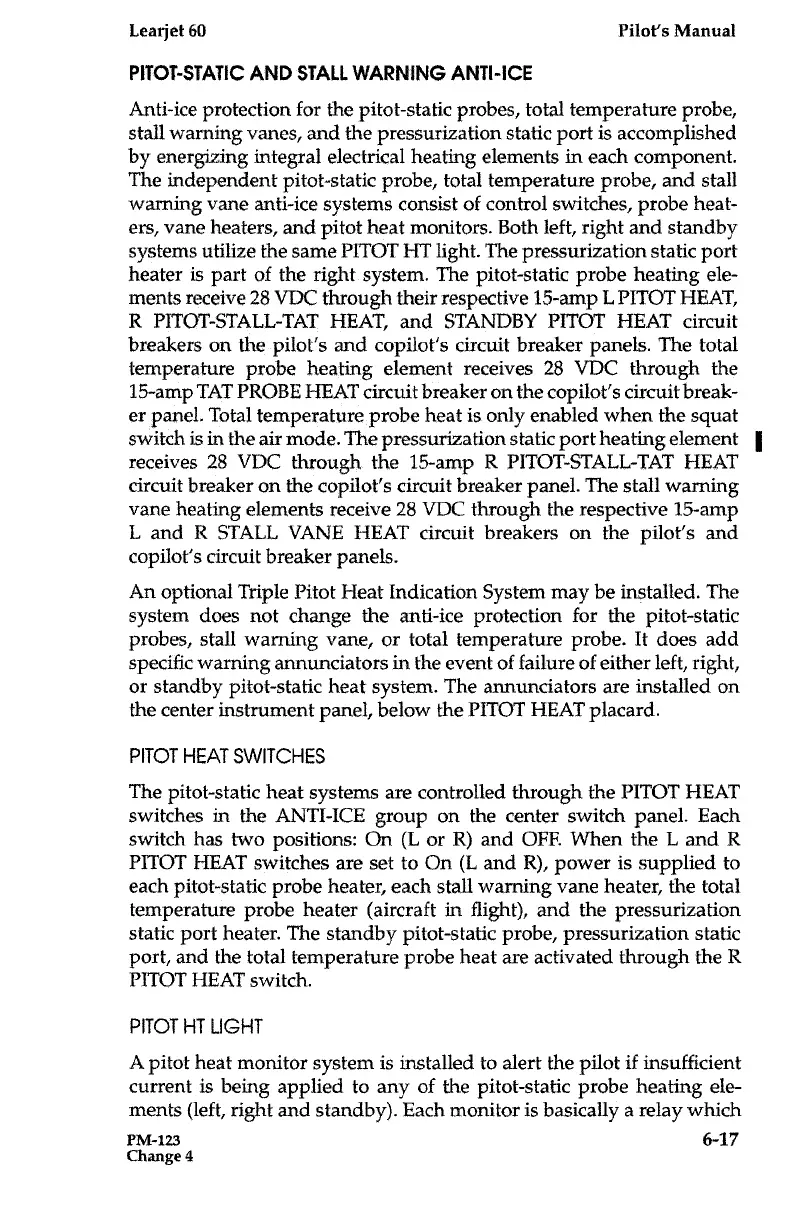 Learjet 60 - PITOT HEAT Switches; PITOT HT Light; Pitot-Static and Stall Warning Anti-Ice