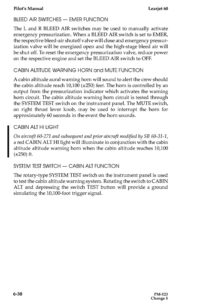 Learjet 60 - BLEED AIR Switches - EMER Function; CABIN ALT HI Light; Cabin Altitude Warning Horn and Mute Function; SYSTEM TEST Switch - CABIN ALT Function
