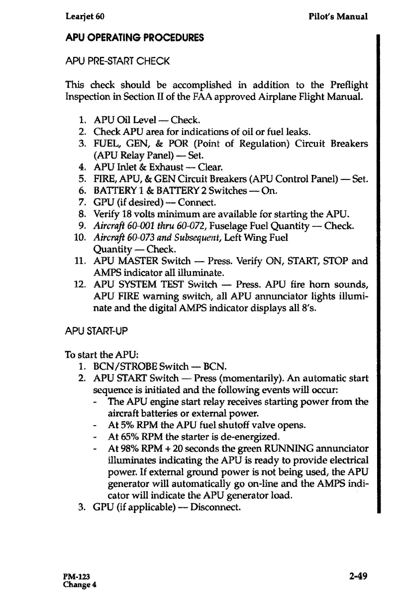Learjet 60 - APU Operating Procedures; APU Pre-Start Check