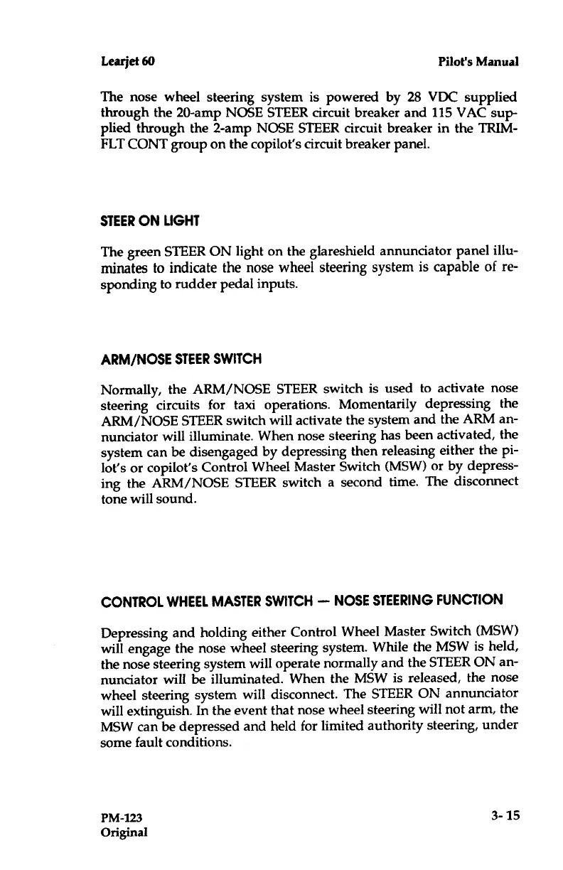 Learjet 60 - ARM;NOSE STEER Switch; Control Wheel Master Switch - Nose Steering Function; STEER on Light